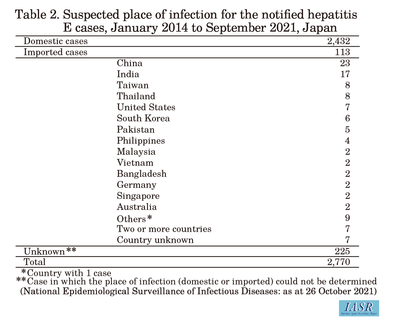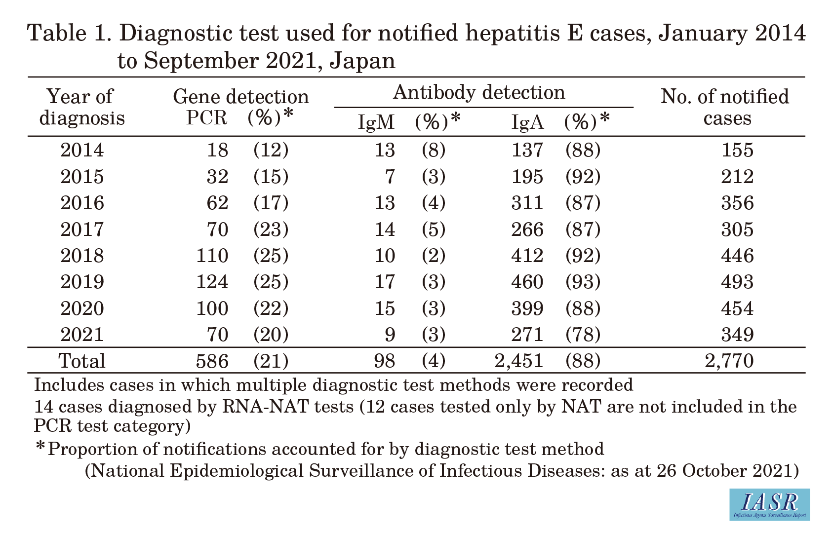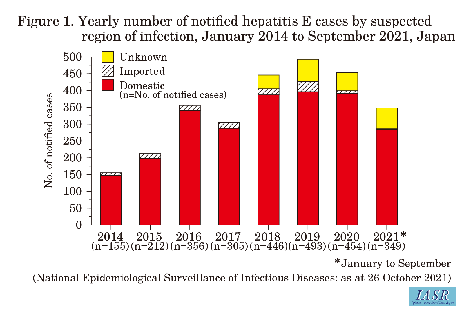 From January 2014 to September 2021, 2,770 cases were notif ied under the NESID system (as at October 26, 2021, Table 1). While 100 cases or fewer were reported annually in 2005-2011 (IASR 35: 1-2, 2014), more than 200 cases have been reported annually since 2015, with more than 400 cases being reported annually since 2018 (Table 1).