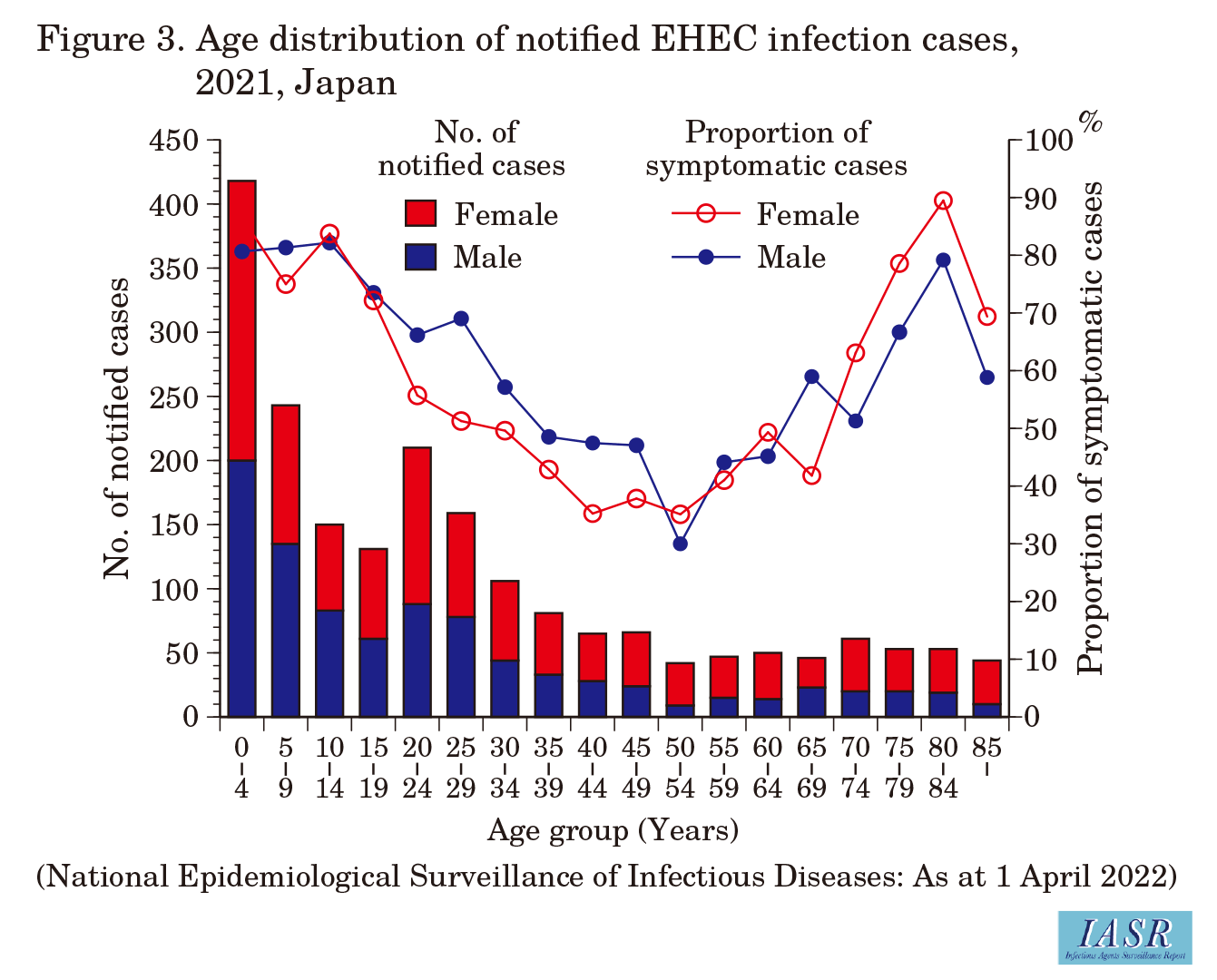 Cases notified under the NESID system: Based on NESID, in 2021, a total of 3,236 cases of EHEC infection were reported, including 2,022 symptomatic cases and 1,214 asymptomatic cases (asymptomatic cases are detected during active epidemiologic investigations or routine stool specimen screening of food handlers) (Table 1). The total number of cases reported in 2021 was 84.1% (80.3% in 2020) of the average number of cases reported between 2011 and 2019. Consistent with previous years, the number of cases peaked in summer (Fig. 1), but there were more reported cases in 2021 than in 2017-2020 during weeks 49-52. Reports from the 10 prefectures with the most notifications, Tokyo, Kanagawa, Hokkaido, Osaka, Fukuoka, Aichi, Saitama, Chiba, Ibaraki, and Hiroshima, accounted for 56% of all notified cases (including asymptomatic cases). The annual number of notified cases per 100,000 population was highest in Iwate Prefecture (6.4), followed by Nagasaki (6.3) and Shiga (5.4) prefectures (Fig. 2). The notification rate per 100,000 population among 0-4-year-olds was highest in Nara (43.2), Nagasaki (40.8), and Kagoshima (30.6) Prefectures (Fig. 2). The proportion of symptomatic cases among notified cases was high among the <20-year-old and ≥70-year-old age groups in both males and females (Fig. 3).