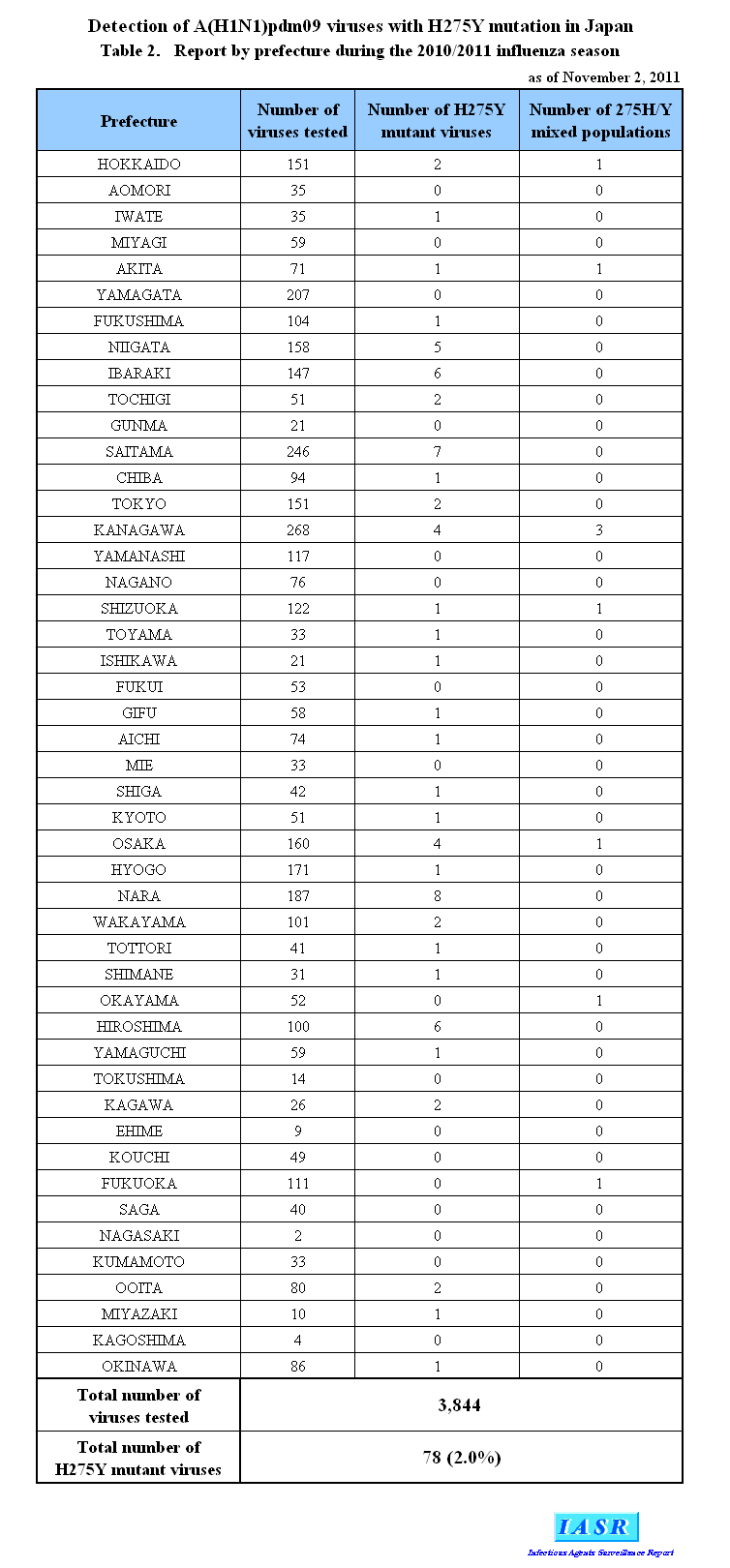 - Table 2. Detection of A(H1N1)pdm09 viruses with H275Y mutation in Japan, Report by prefecture