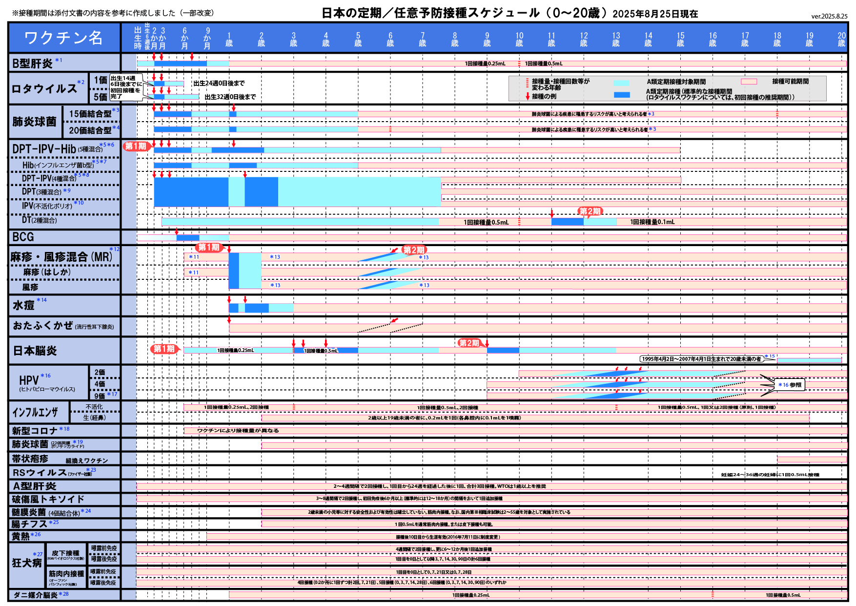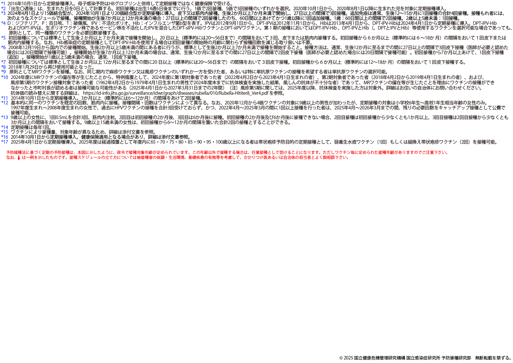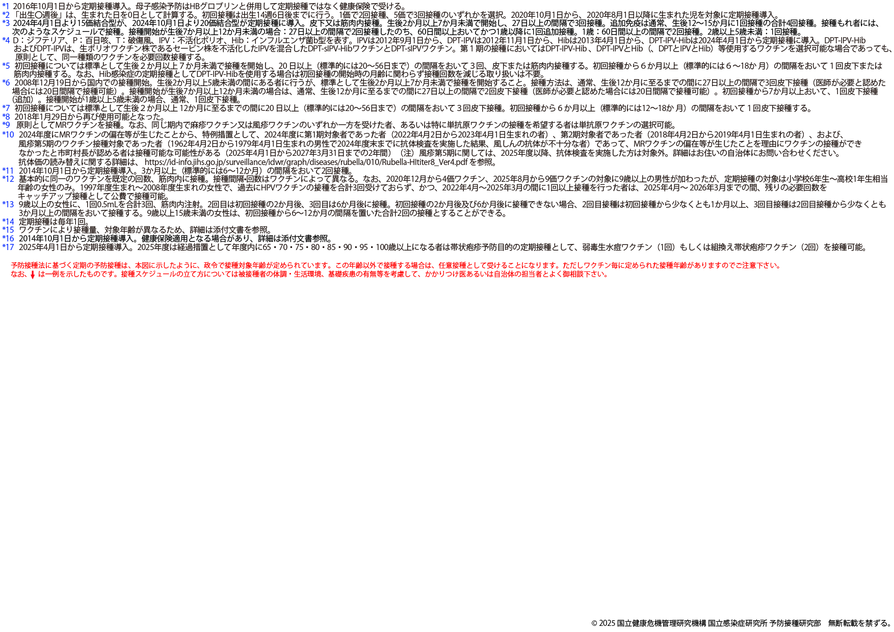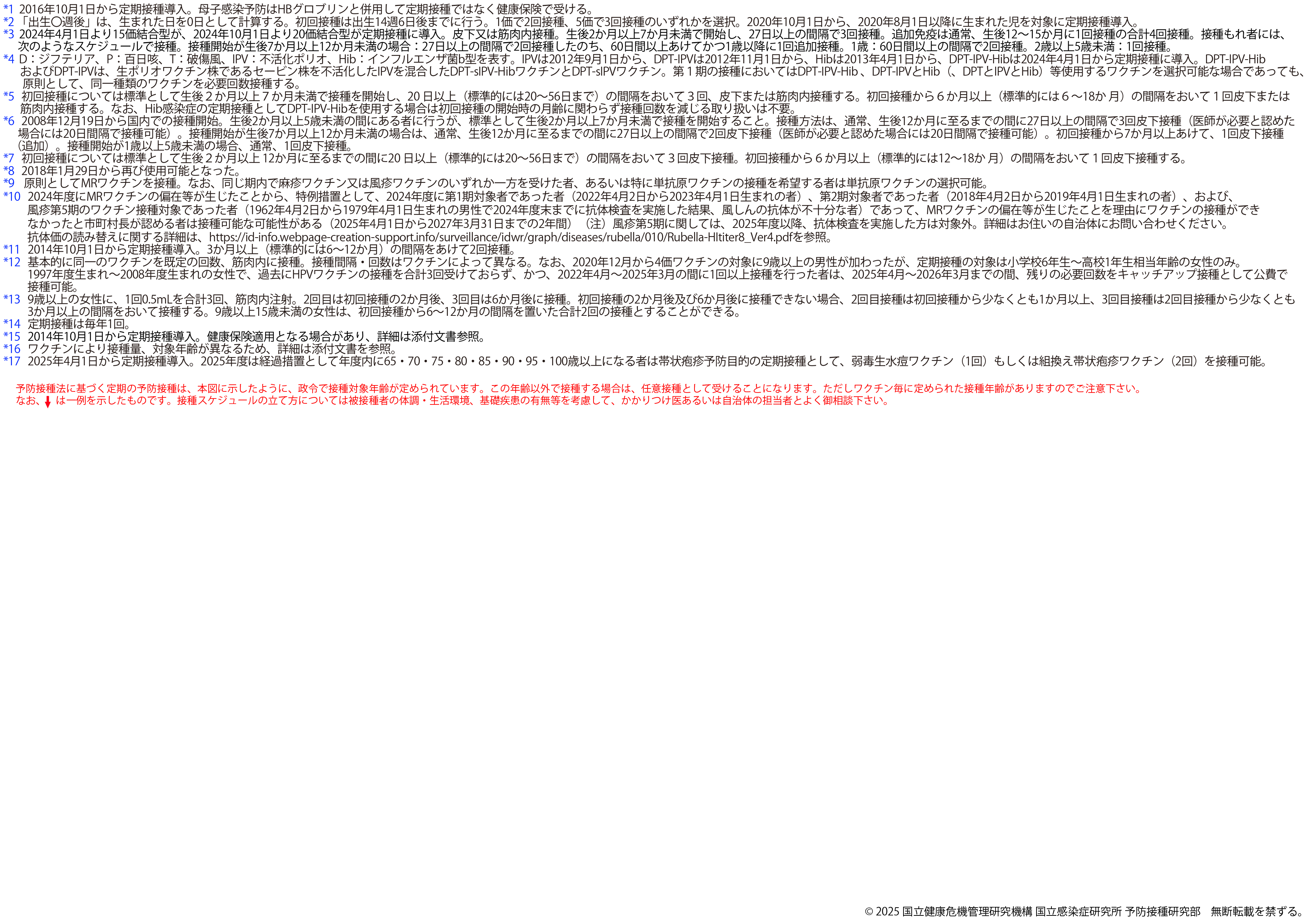 ※2025年8月25日版 変更点:ヒトパピローマウイルスワクチンの注釈(*16,*17)へ9価ワクチンの対象に9歳以上の男性への接種が加わったことに伴う変更を追記しました。