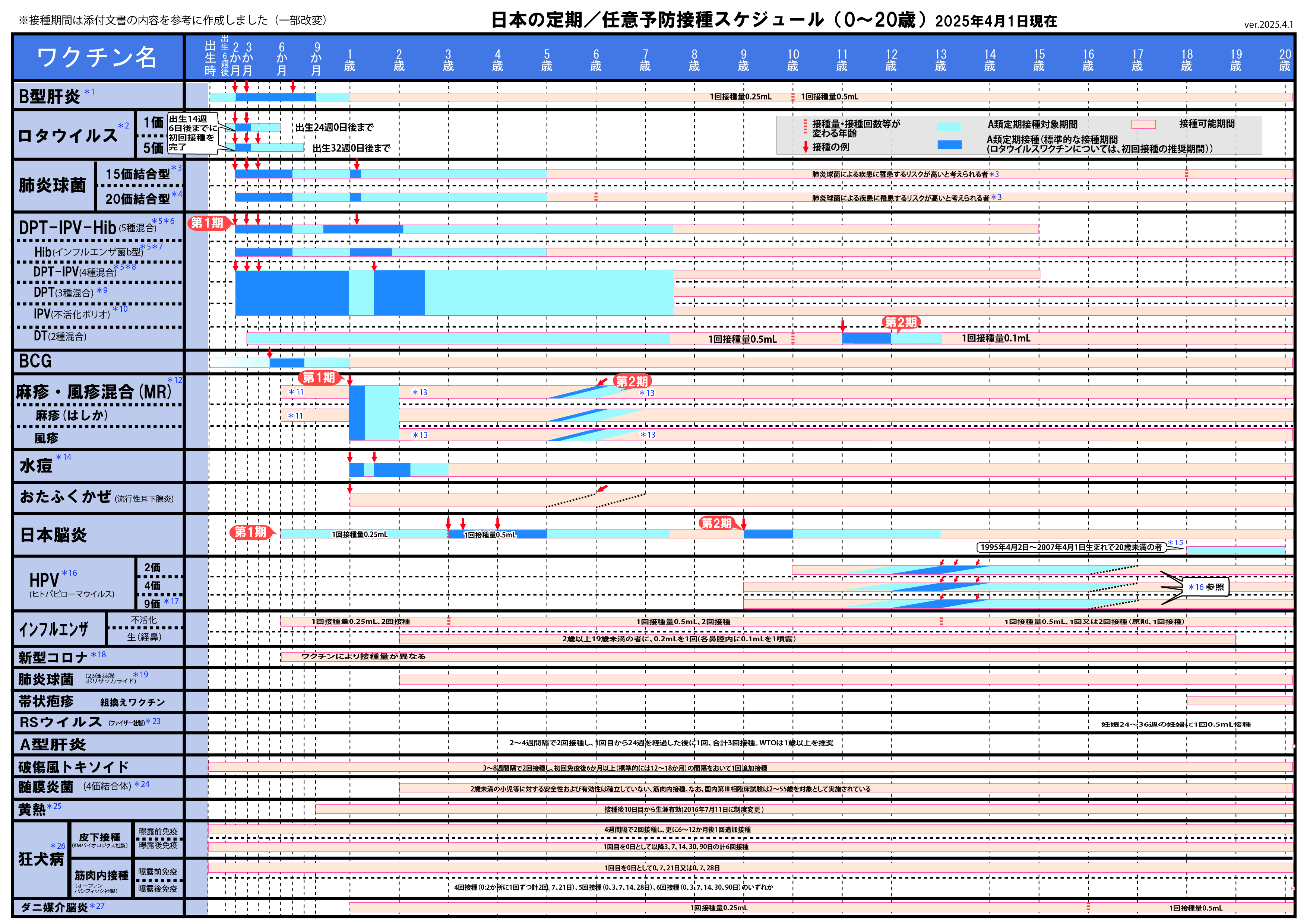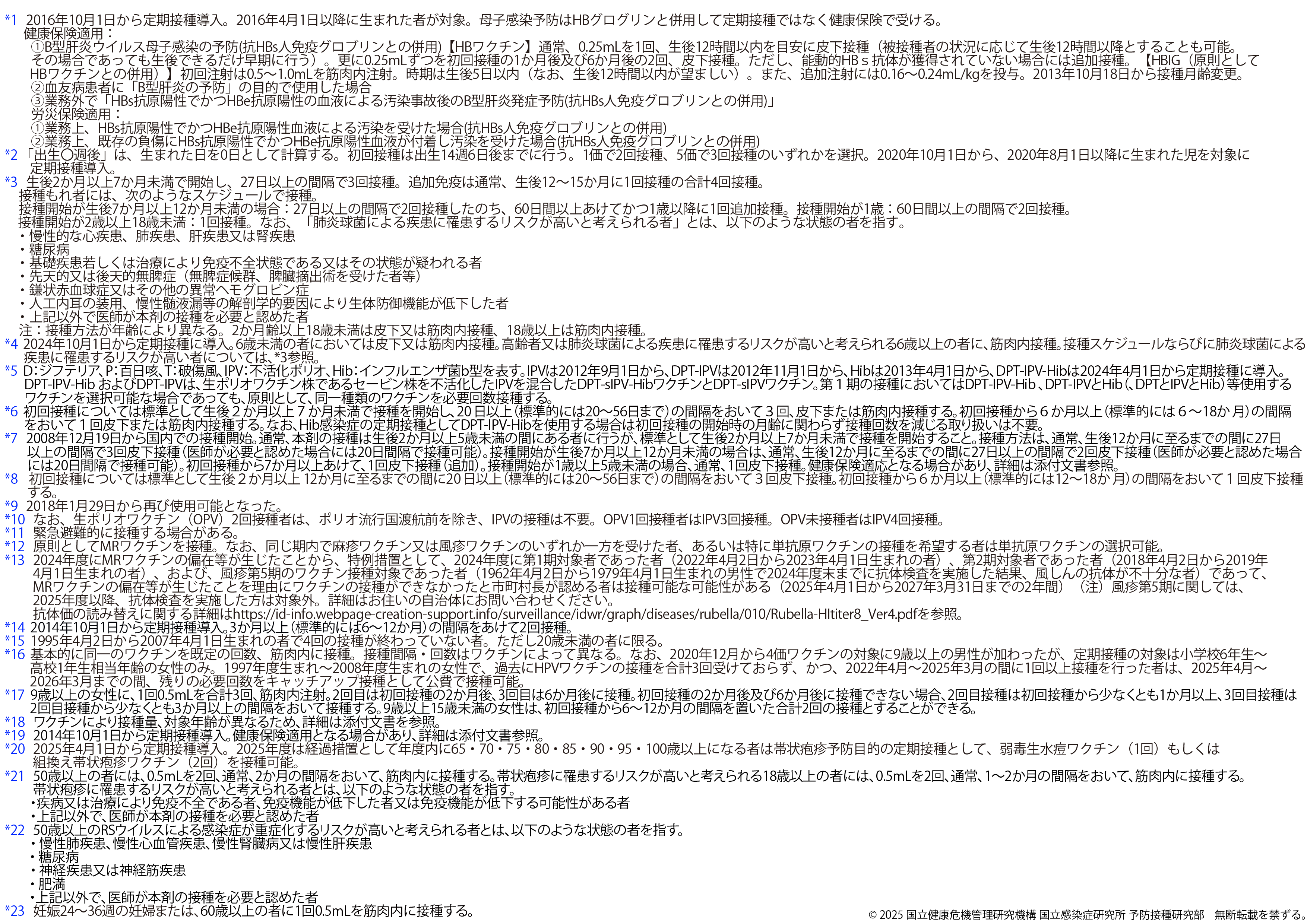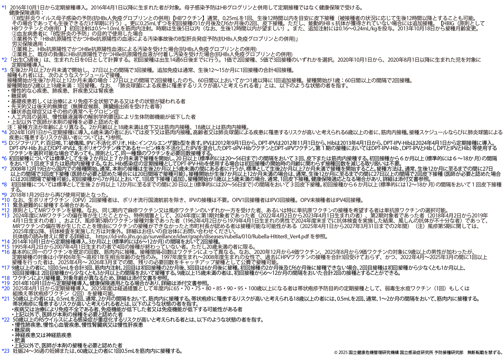 ※2025年8月25日版 変更点:ヒトパピローマウイルスワクチンの注釈(*16,*17)へ9価ワクチンの対象に9歳以上の男性への接種が加わったことに伴う変更を追記しました。