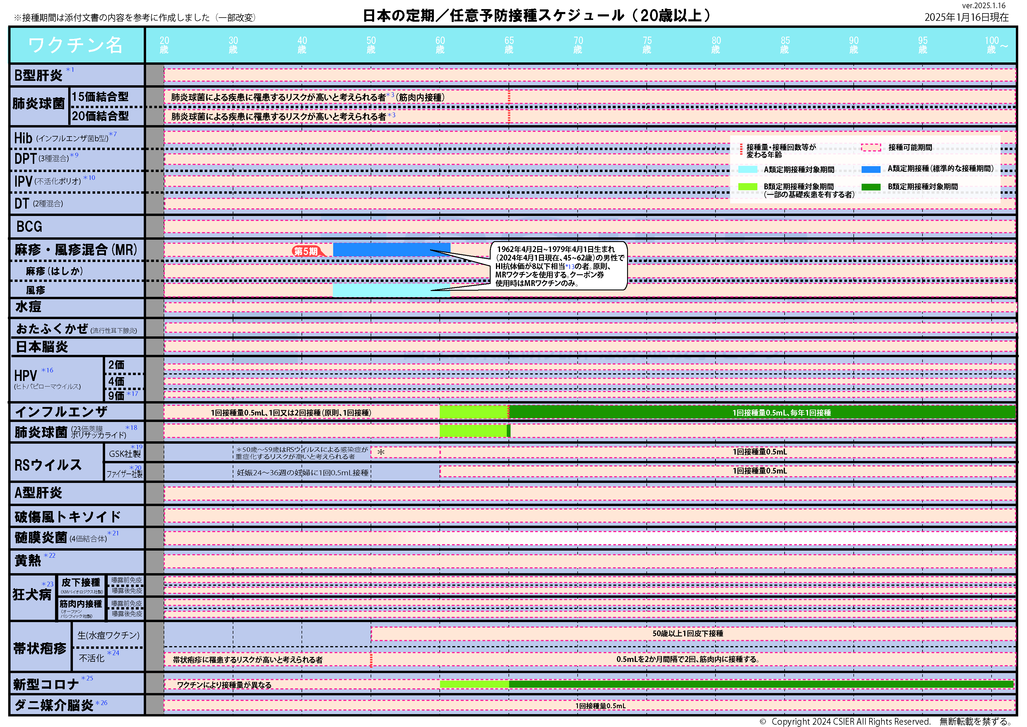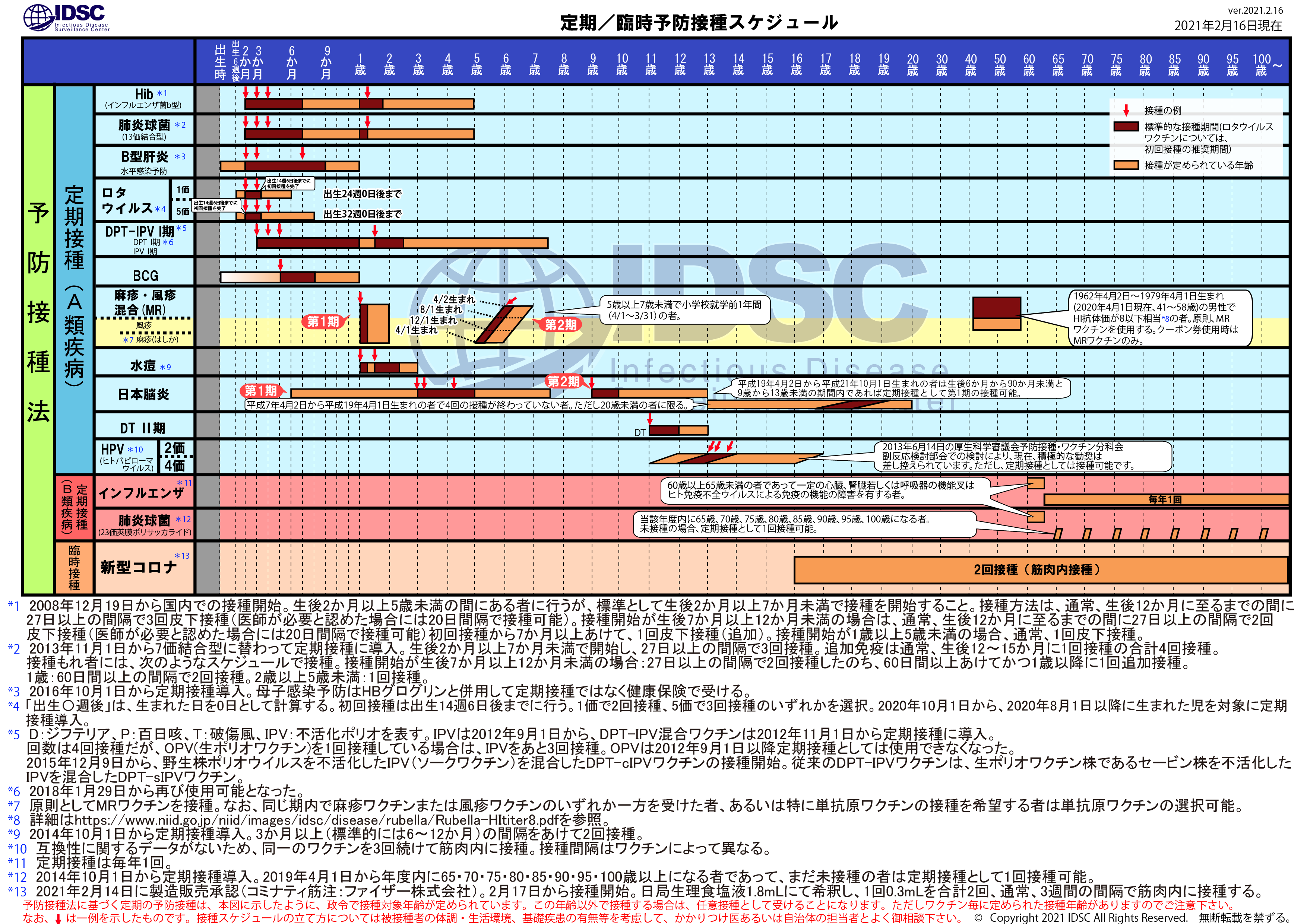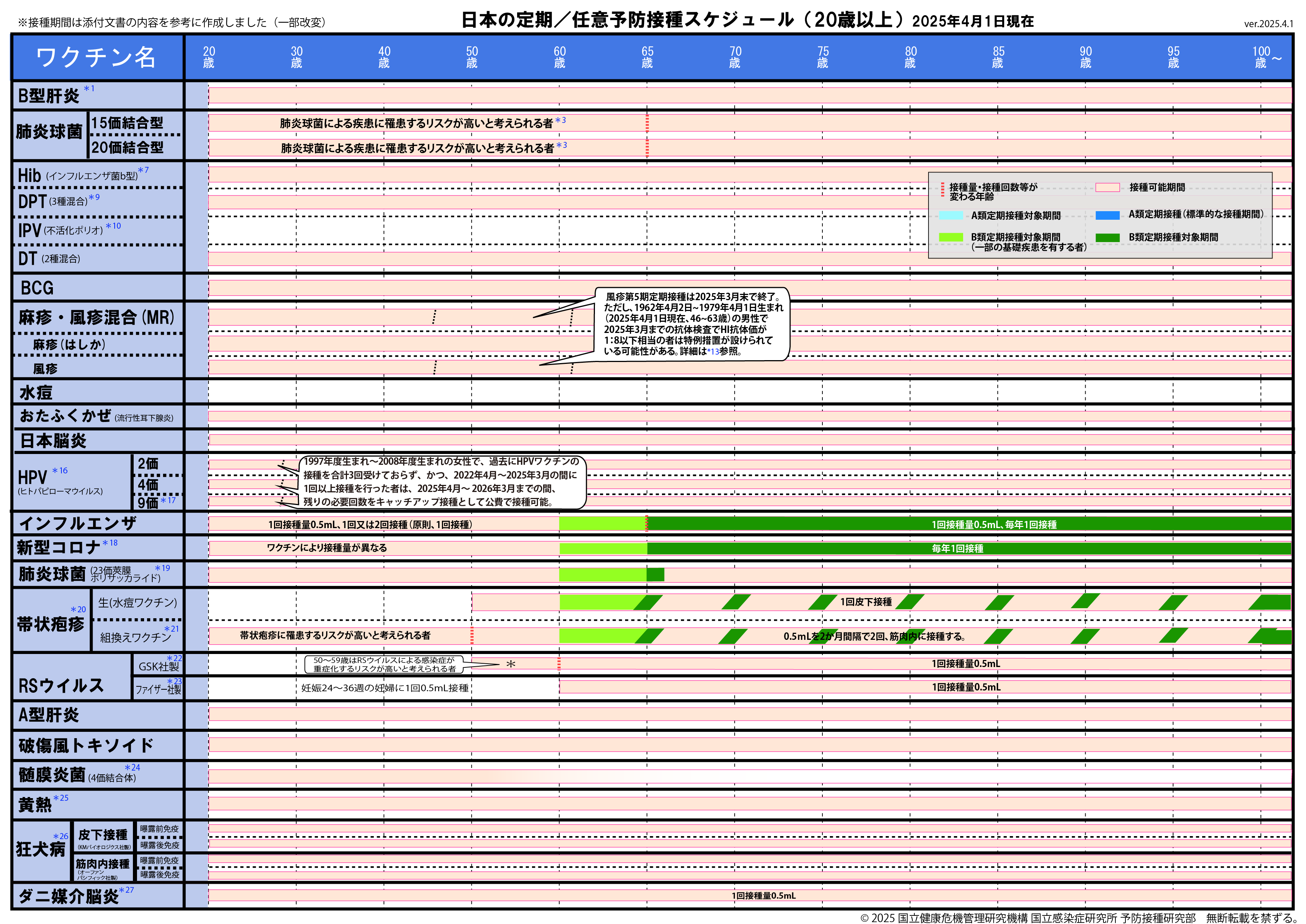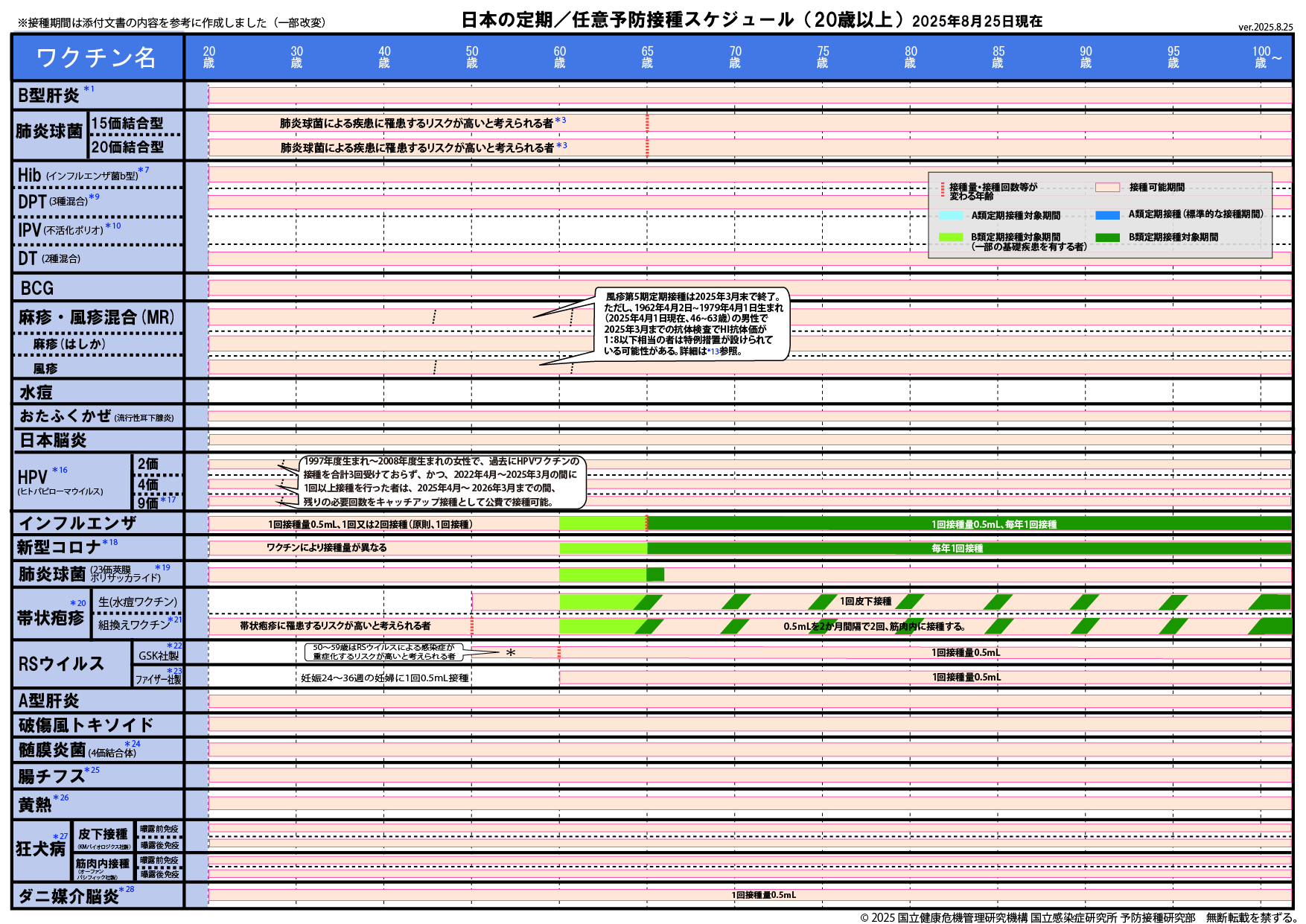 ※2025年8月25日版 変更点:ヒトパピローマウイルスワクチンの注釈(*16,*17)へ9価ワクチンの対象に9歳以上の男性への接種が加わったことに伴う変更を追記しました。