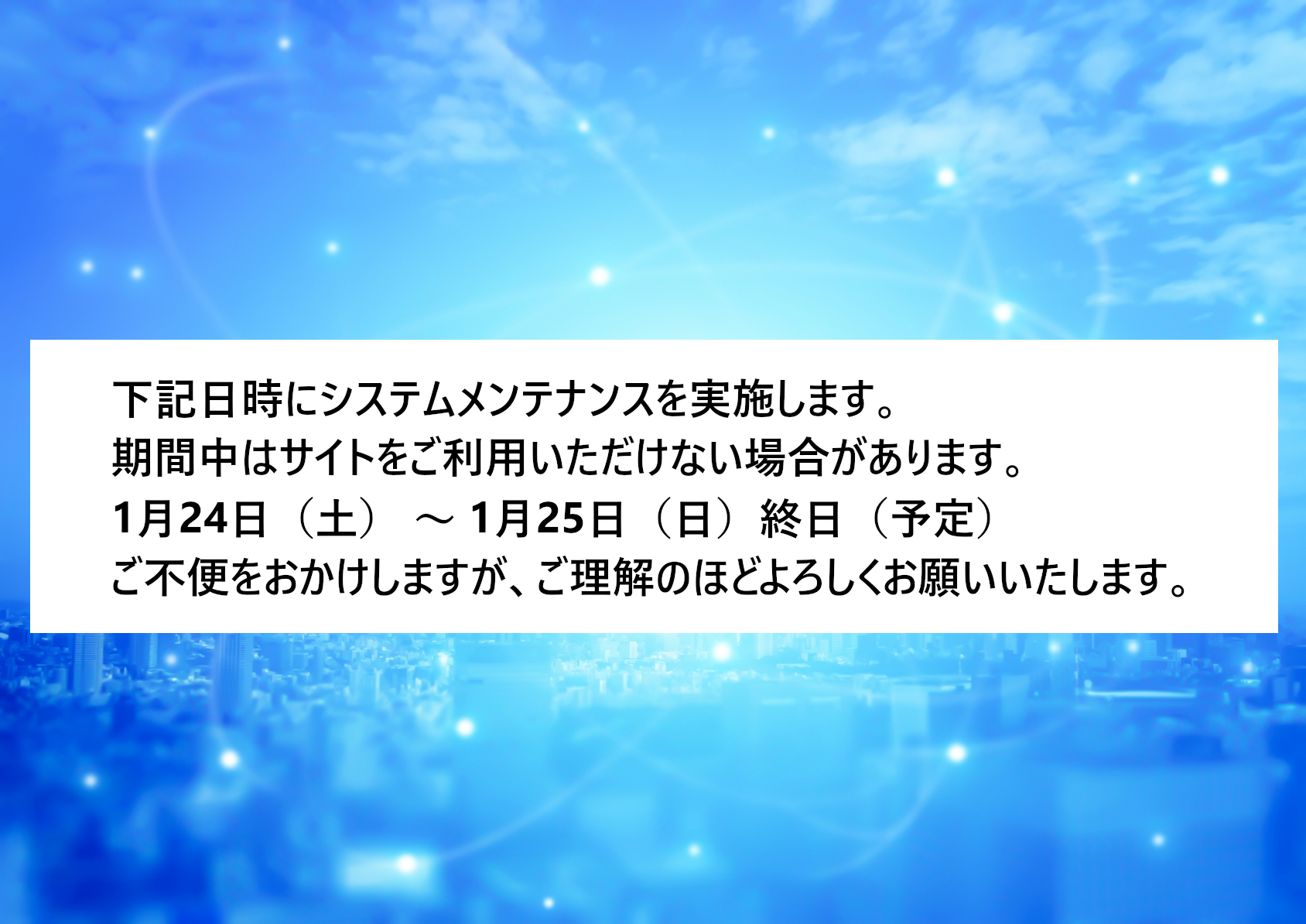 下記日時にシステムメンテナンスを実施します。期間中はサイトをご利用いただけない場合があります。 1月24日(土) ~ 1月25日(日)終日(予定) ご不便をおかけしますが、ご理解のほどよろしくお願いいたします。