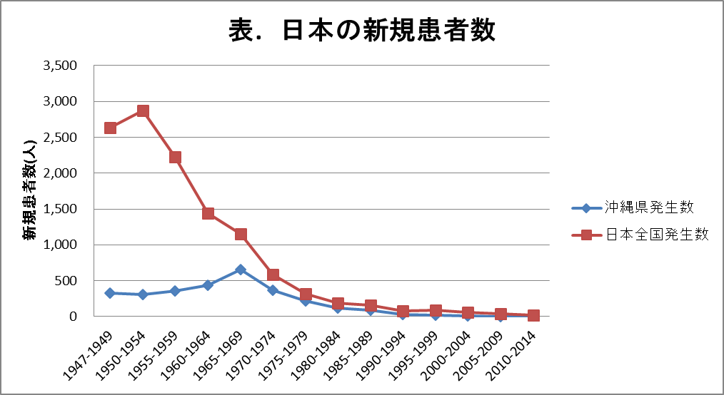日本の新規患者は毎年、日本人は数名、在日外国人は約4名である。日本人では沖縄県出身者が半数を占めているものの、新規患者の減少が著しく、かつ高齢化している(表)。一方、在日外国人患者についてはブラジルなどの患者の多い国からの出身者が目立つ。