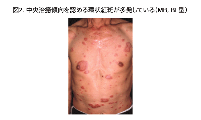 痒みや痛みなどの自覚症状のない治りにくい皮疹で、白斑、紅斑、環状紅斑(図2)、結節など多彩である。皮疹にほぼ一致して知覚の鈍麻や麻痺を認める。これは末梢神経がらい菌によって障害されたためである。さらに、毛根や汗腺も障害されて、脱毛や発汗低下も起こる。