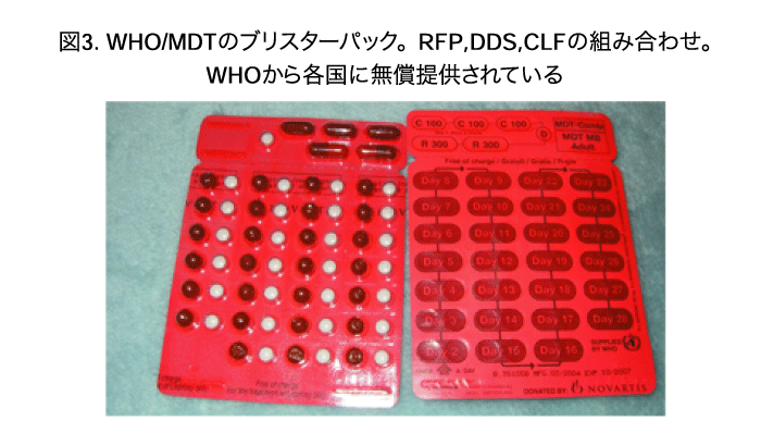 治療は世界保健機関(WHO)の推奨する複数の抗菌薬リファンピシン(RFP)、サルファ剤(DDS)、クロファジミン(CLF)をPBでは半年、MBでは数年間内服する(多剤併用療法,MDT)(図3)ことで治癒する。