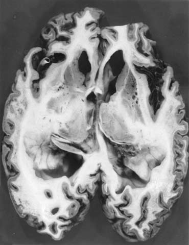 脳波は初期から基礎律動の不規則性がみられ、その後高振幅鋭徐波(PSD)が出現するのがCJDの特徴である。脳CT画像上では初期に軽度の大脳皮質の萎縮、脳室拡大がみられ、その後急速な大脳、小脳の萎縮、著明な脳室拡大、白質のびまん性低吸収域が認められる。CJD解剖例(北大分子細胞病理、長嶋和郎教授供与)の脳割面(写真1)では、大脳、小脳の脳溝拡大と全脳室の拡大が高度であり、大脳、小脳皮質が薄くなる。vCJD例では脳波のPSDはみられず、MRIで視床枕の高電子密度が特異的所見であると報告された。