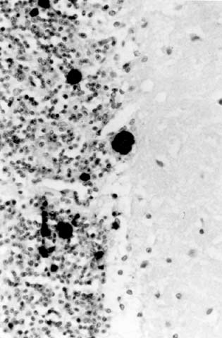解剖脳の病理検索では皮質の萎縮、特有の海綿状変化、神経細胞の脱落、アミロイド斑などが指標となる。異常プリオン蛋白からなるアミロイド斑を抗プリオンペプチド抗体によって免疫染色した例(北大分子細胞病理、長嶋和郎教授供与)を示す(写真2)。小脳顆粒層の境界部に抗体によって染色された部分を認める。PCRによるゲノムの解析では、血液などから抽出したゲノムDNAをもとにプリオン遺伝子のシークエンスを決定する。日本人の遺伝性プリオン病では、東北大の北本哲之教授らによってコドン102、105、145、178、180、198、200、210、217、232などに変異が発見されている。