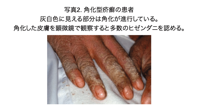 角化型疥癬は、桁違いに多数のヒゼンダニが感染した疥癬の重症型である(写真2)。患部は肥厚した灰色~帯黄白色の角質増殖と痂皮に覆われた状態になり、亀裂も生じる。ダニの数は通常の疥癬では数十匹であるが、角化型では100万~200万匹と言われている。