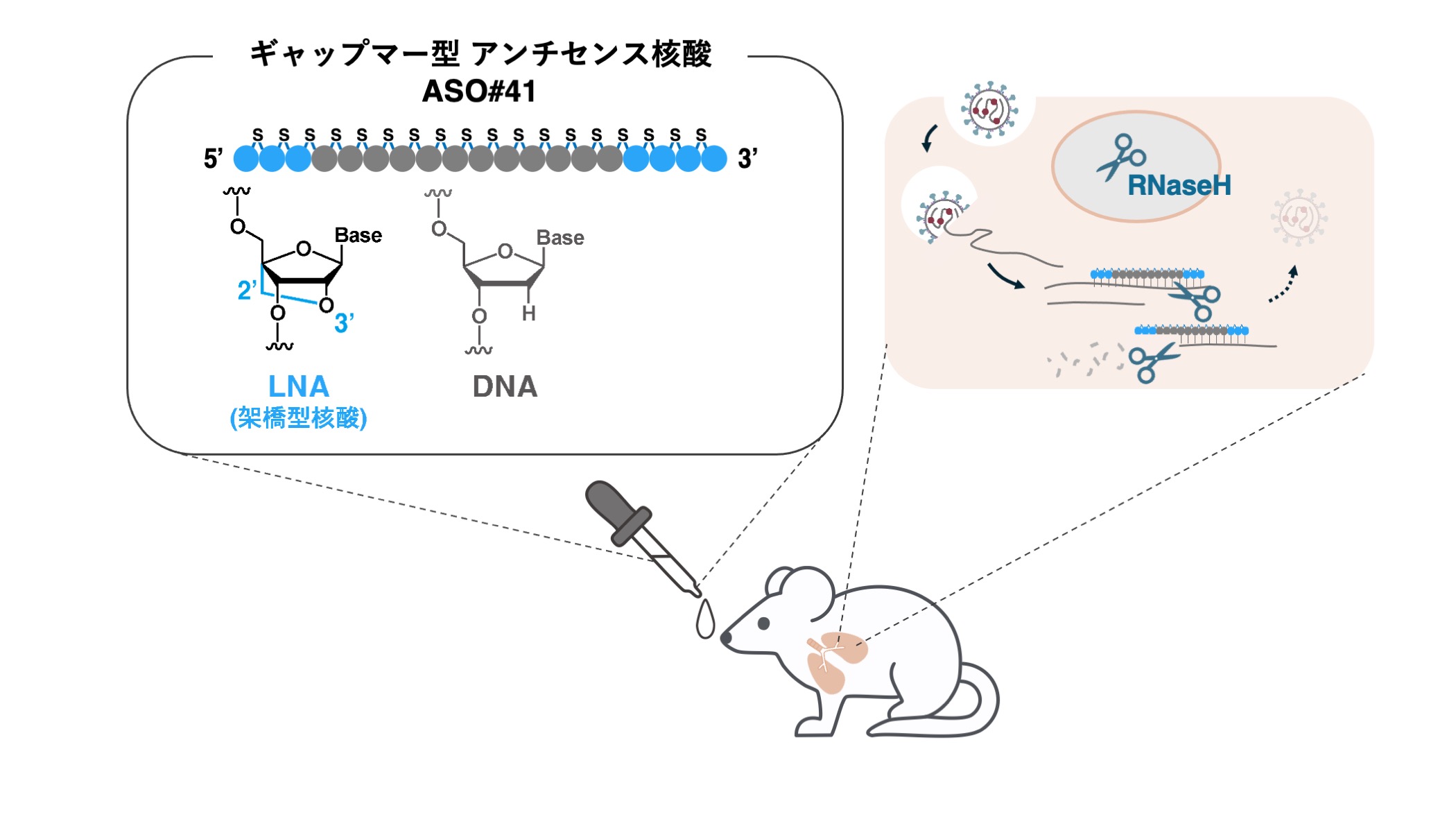 標的の配列情報を基に迅速に設計可能なアンチセンス核酸(ASO)は、新興再興感染症対応に有用な手段の一つとして期待される。本研究ではSARS-CoV-2ゲノムに対する292のギャップマー型ASOを設計し、培養細胞系での評価により、抗SARS-CoV-2活性を有するASO#41を同定した。ASO#41はメインプロテアーゼ領域RNAを標的としており、調べた全てのSARS-CoV-2バリアントに活性を示した。ASO#41は経鼻投与により肺組織に選択的に蓄積し、SARS-CoV-2感染マウスモデルで有意な抗ウイルス活性を認めた。さらにASO のwing RNA構造または塩基間架橋構造の置換により、さらに高い活性を示すASO#41誘導体を見出した。本研究成果は、アンチセンス核酸モダリティを用いた抗呼吸器ウイルス薬創出に有用な知見を提供するものである。