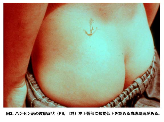図2.ハンセン病の皮膚症状(PB,1群)左上臀部に知覚低下を認める白斑局面がある。