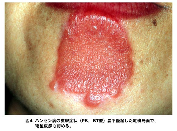 図4.ハンセン病の皮膚症状(PB,BT型)扁平隆起した紅斑局面で、衛星皮疹も認める。