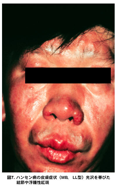 図7.ハンセン病の皮膚症状(MB,LL型)光沢を帯びた結節や浮腫性紅斑