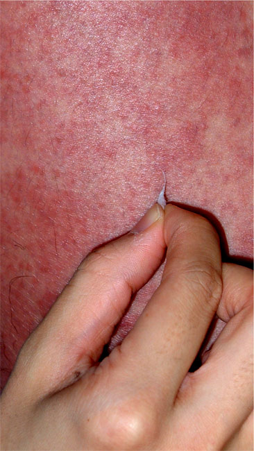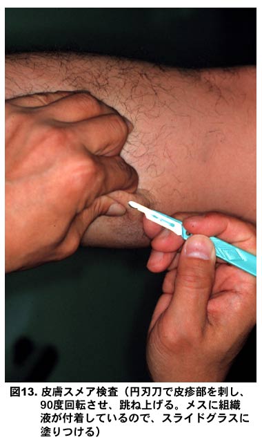 図13.皮膚スメア検査(円刃刀で皮疹部を刺し、90度回転させ、跳ね上げる。メスに組織液が付着しているので、スライドグラスに塗りつける)
