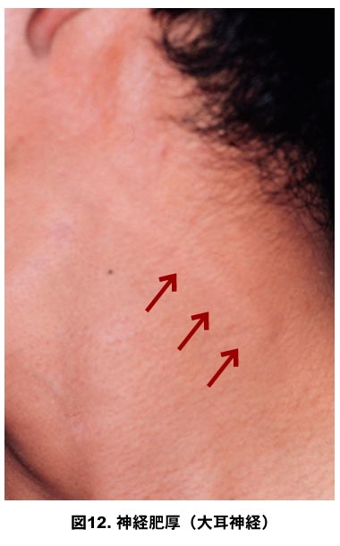 痒みのない皮疹部とその周辺の神経学的検査(触覚、痛覚、温度覚)を行います。神経の肥厚、運動障害、等も検査します(図9~12)。