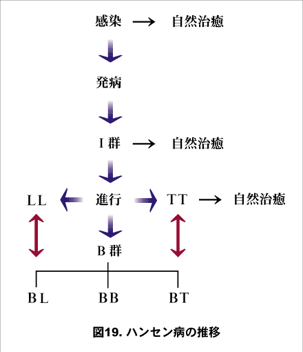 らい菌の数、皮疹の性状や数、知覚障害、神経肥厚、運動障害、病理組織所見などで患者間に多様性がみられますが、これはらい菌に対する生体の免疫能の差で、病型として分類されています。発症初期のI群、その後治癒するか、または進展してらい菌に対し免疫能が高いTT型、全く反応しないLL型、それらの中間のB群(BT型、BB型、BL型に細分する)に進展していきます(Ridley‐Jopling 分類)(図19)。