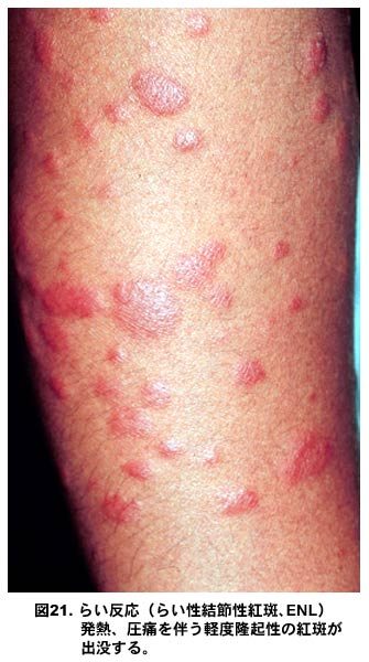 図20.らい反応(らい性結節性紅斑、ENL)発熱、圧痛を伴う軽度隆起性の紅斑が出没する。