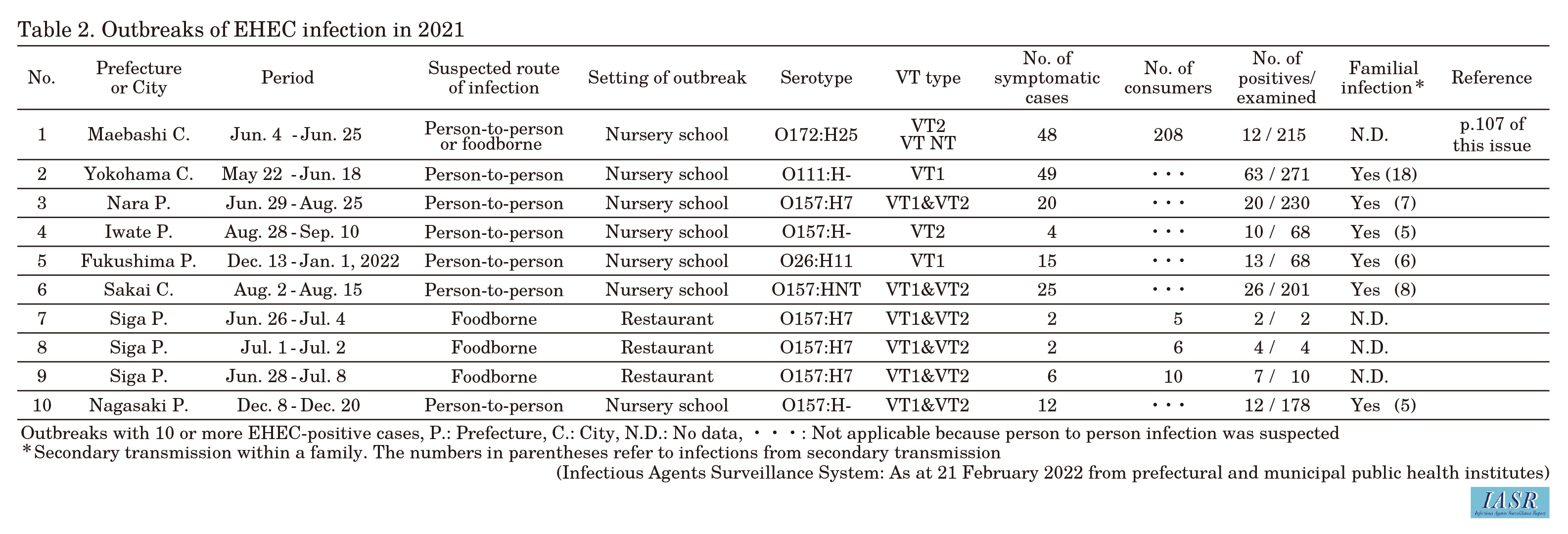 Outbreaks: As in previous years, EHEC outbreaks in nursery schools and other locations occurred in 2021 and were presumed to be due to person-to-person transmission (Table 2). In June 2021, an outbreak of O172 VT2 infection was reported (see p.107 of this issue). Additionally, nine outbreaks of food poisoning events due to EHEC, with a total of 42 patients (including EHEC isolation-negative cases), were reported under the Food Sanitation Law (32 outbreaks involving 456 cases in 2018; 20 outbreaks involving 165 cases in 2019; five outbreaks involving 30 cases in 2020) (Table on p.106, see pp.112 and 114 of this issue). Analysis by the Department of Bacteriology I of the NIID revealed that strains exhibiting the same MLVA type or SNP among sporadic cases of unknown epidemiologic association were isolated from a wide geographic area (see pp.108 and 109 of this issue).