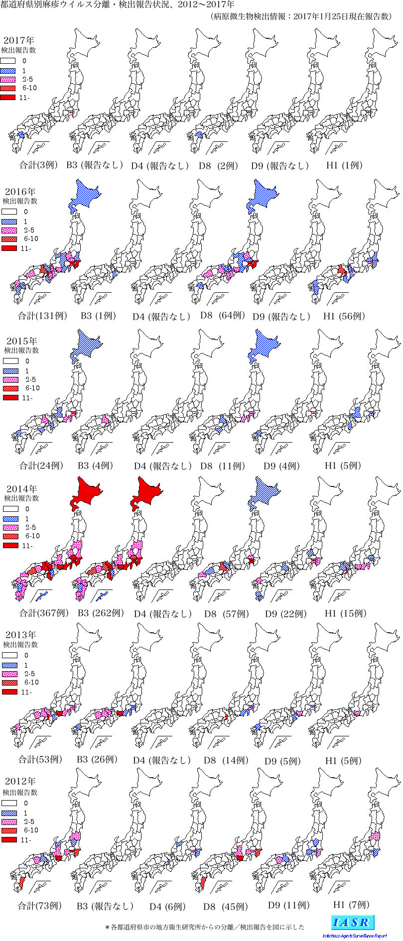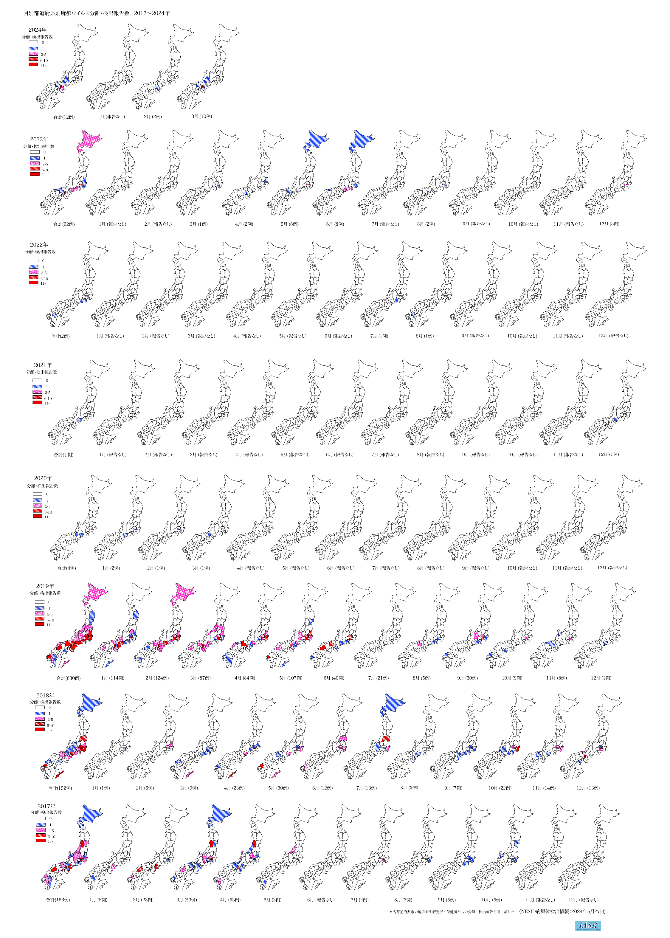 - 月別都道府県別麻疹ウイルス報告数:2017~2024年