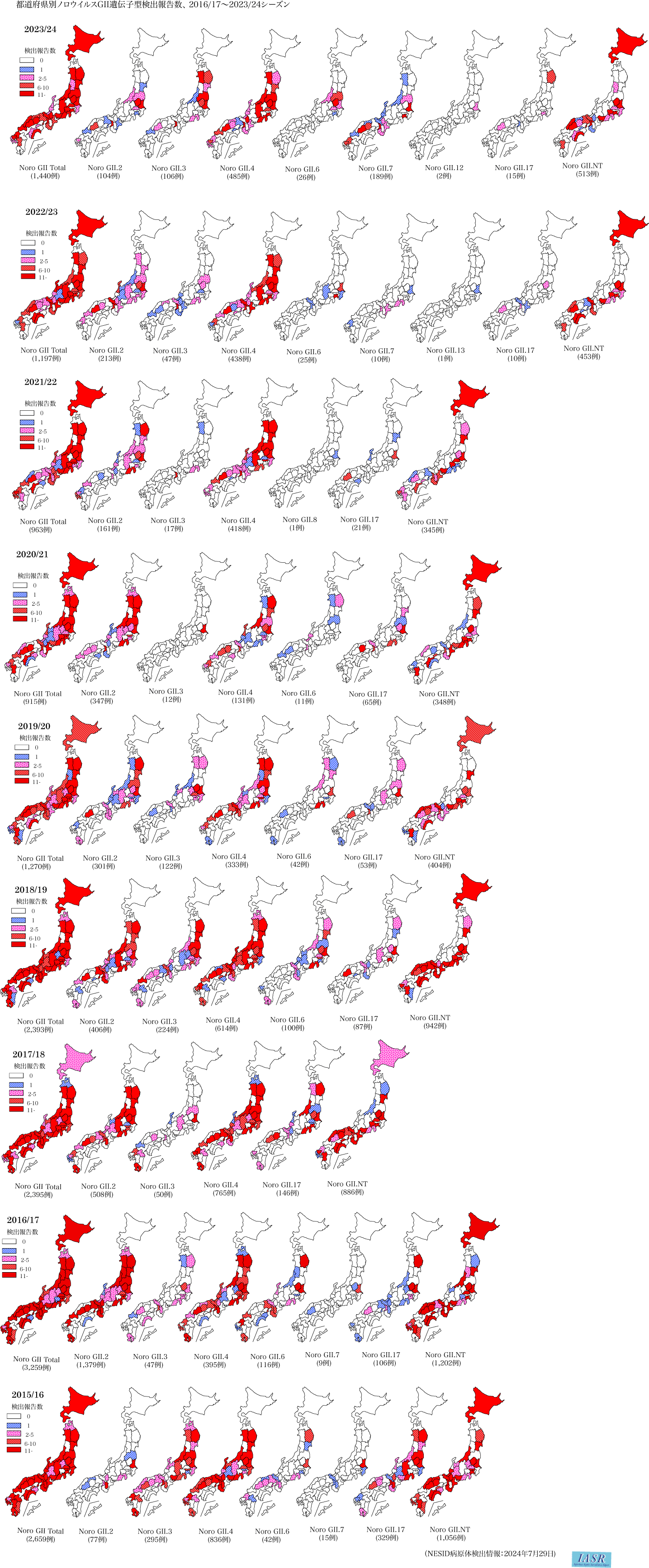 トップページ > サーベイランス > 病原微生物検出情報 (IASR) > 都道府県別ノロウイルスG2遺伝子型検出報告数
