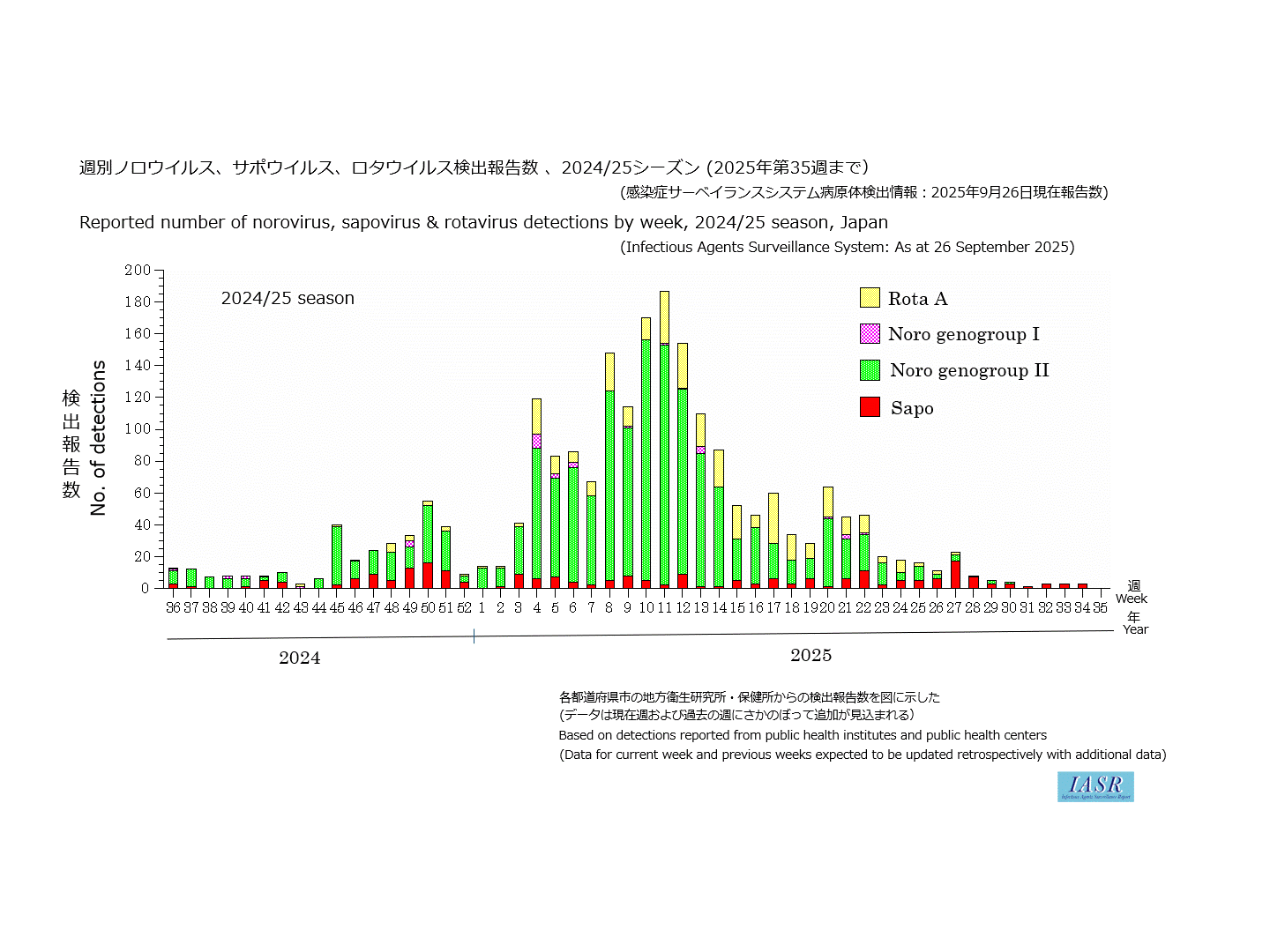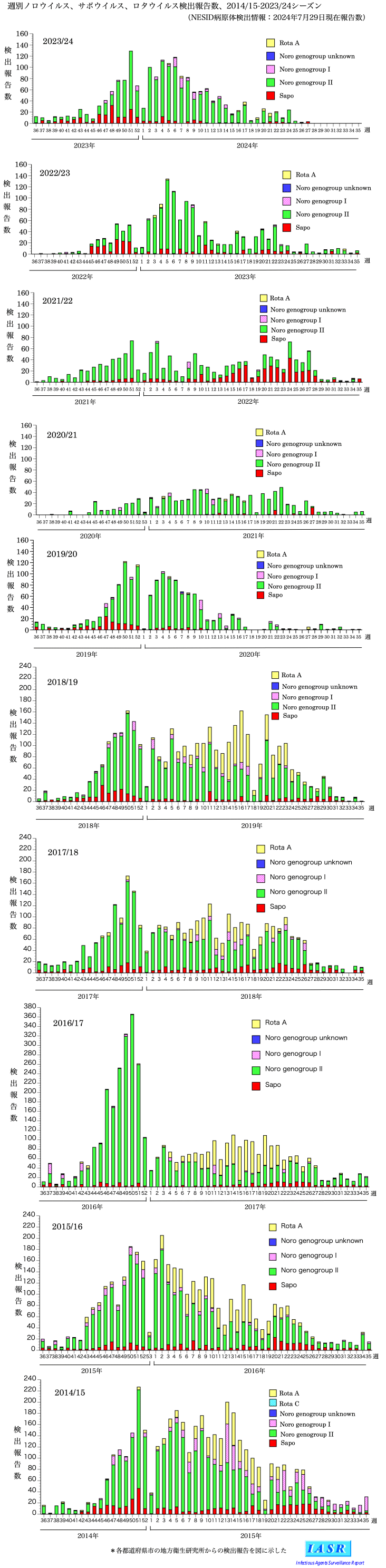 トップページ > サーベイランス > 病原微生物検出情報 (IASR) > 週別ノロ・サポ・ロタウイルス検出報告数