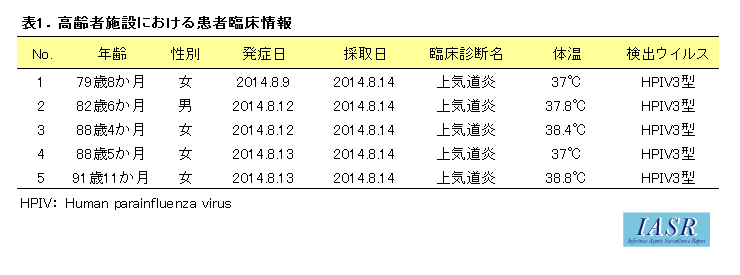 高齢者施設におけるヒトパラインフルエンザウイルス3型集団感染事例(2014年7~8月)および小児におけるヒトパラインフルエンザウイルス流行疫学(2014年)―三重県