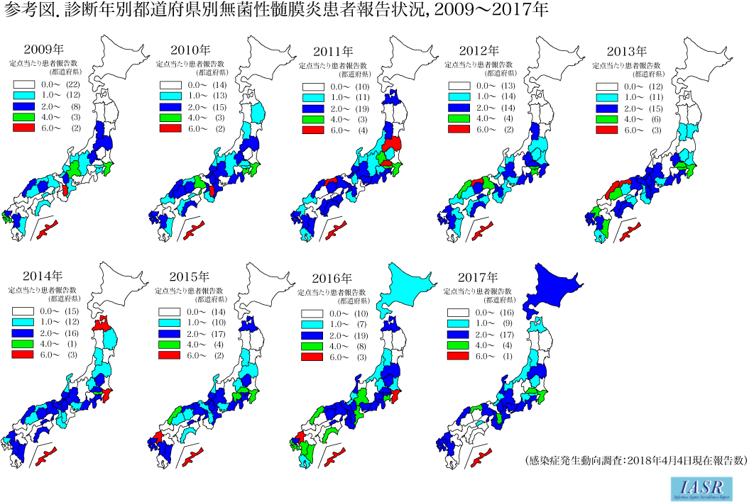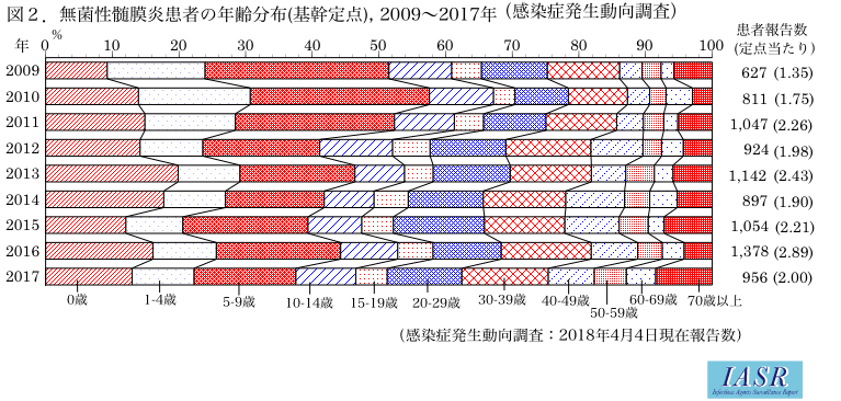 図1に2009~2017年の週別定点当たりの無菌性髄膜炎報告数を示す。日本では毎年夏を中心に無菌性髄膜炎の流行が報告されている。都道府県別の定点当たりの報告数は地域により差があった(参考図)。無菌性髄膜炎患者の年齢分布は0歳が最も多く、2009~2011年は10歳未満が半数以上を占めたが、2012年以降は10歳以上の報告割合が増加した(図2)。