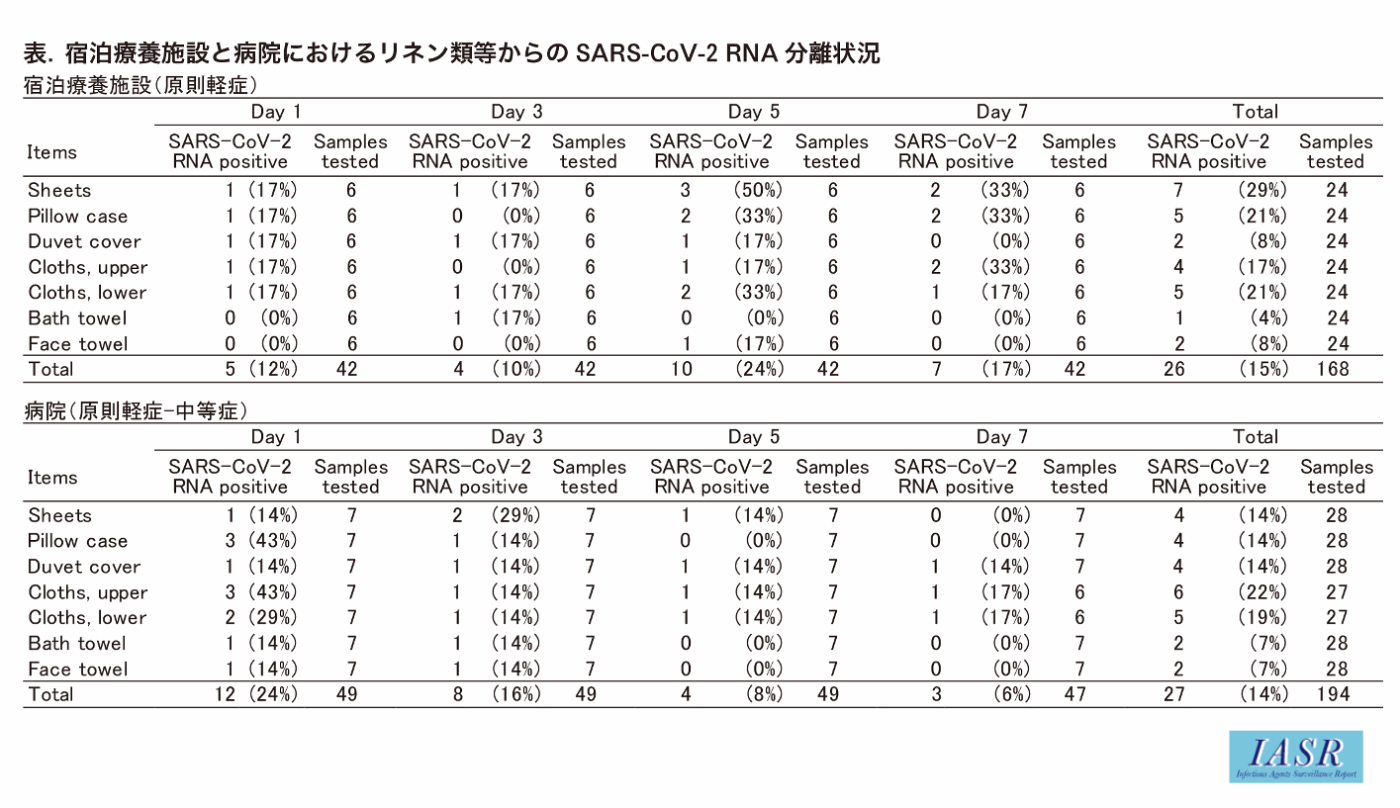 宿泊療養施設から6人、病院から7人の計13人を調査対象とした。属性は女性7人(54%)、年齢中央値46歳(四分位範囲33-55歳)、8人(62%)が有症状軽症者で、残りは無症状であった。宿泊療養施設の4人、病院の4人が使用したリネン類等からSARS-CoV-2 RNAが検出された。検出頻度はシーツ、ワンピース型寝間着、枕カバー、かけ布団カバーからが8-29%、バスタオルとフェイスタオルからが4-8%であり、各リネン類等の総検出割合は宿泊療養施設と病院で頻度に違いを認めなかった(表)。Ct値34未満の検出は宿泊療養施設ではDay5まで、病院ではDay3まで確認された。しかし、それらの検体からウイルスは分離されなかった。PPEのうち、ガウン上部1検体(2%)、ガウン下部5検体(10%)の計6検体からRNAが検出されたが、N95マスクとゴーグルからは検出されなかった。鼻咽頭検体採取後のPPEからRNAは検出されなかった。空気検体では、宿泊療養施設(回収前4、回収後7)のほうが病院(回収前2、回収後3)より高頻度に検出されていた〔回収後29%(7/24)vs 11%(3/28)〕が有意ではなかった。PPE検体と空気検体から検出されたSARS-CoV-2のCt値はいずれも34以上であった。洗濯後のすすぎ液では、水洗いでRNAの検出なし、洗剤洗いで1検体(20%、Ct値40)、柔軟剤洗い1検体(17%、Ct値37)でRNAが検出された。