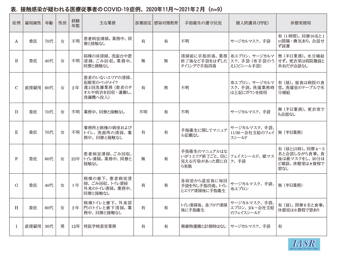 2020年11月20日~2021年2月22日まで、COVID-19アウトブレイクが発生した7施設でRT-PCR検査または抗原検査で新型コロナウイルス(SARS-CoV-2)陽性が確認された清掃員8名と診療放射線技師1名に対し、保健所や病院が集めた情報を収集し、加えて感染者の一部には電話および直接インタビューを実施した。