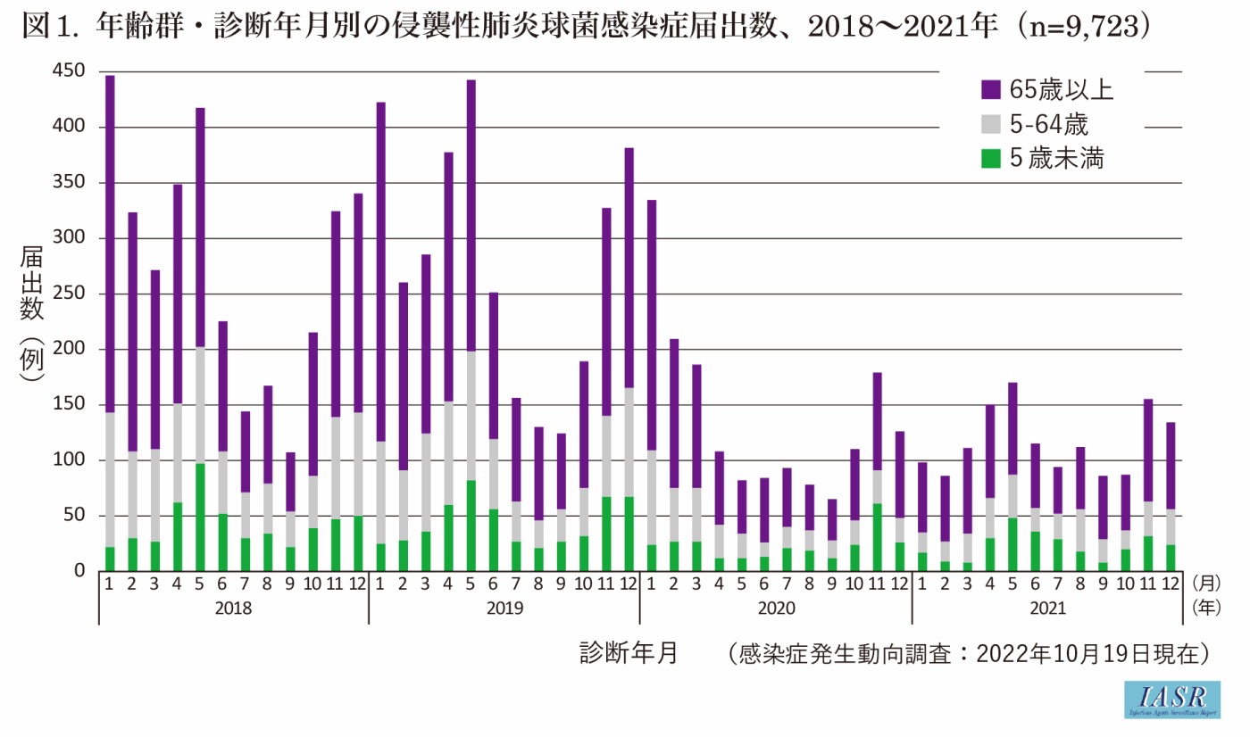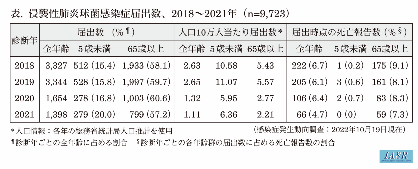 2013年4月からIPDが5類感染症の全数把握疾患に追加された。本記事では、2018~2021年に診断された9,723例について集計した(2022年10月19日現在)。届出数は2018年、2019年に約3,300例であったが、2020年以降は全国的に減少し、2020年は1,654例、2021年は1,398例であった(図1、表)。これまで届出数は冬期~春期に多く、夏期に少ない季節性がみられたが、新型コロナウイルス感染症(COVID-19)流行下の2020年は春期の届出数増加がみられなかった。