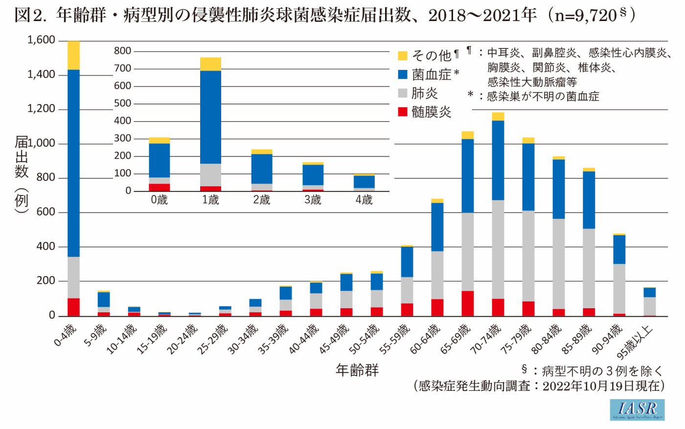 患者属性としては小児と高齢者の届出数が多く、届出時点の死亡報告は高齢者に多かった(表)。各病型の占める割合は年齢により異なった(図2)。5歳未満では髄膜炎が6%、菌血症をともなう肺炎(以下、肺炎)が15%、巣症状をともなわない菌血症(以下、菌血症)が68%であったのに対し、65歳以上では髄膜炎が8%、肺炎が51%、菌血症が38%であった。