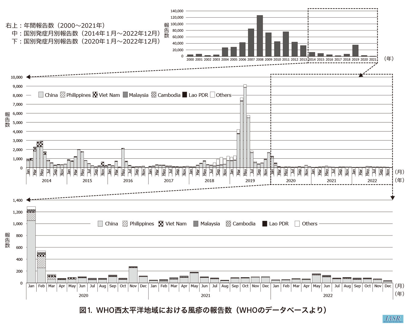 2018~2019年にかけて中国において大規模な風疹流行の再興が起きたが、2020年以降、地域全体での風疹報告数は、最も低い値で推移している(図1中)。2022年9月には、韓国、オーストラリア、香港、シンガポール、ニュージーランド、マカオ、ブルネイ・ダルサラームが、“排除認証の基準に達したサーベイランスの存在と、土着性の風疹ウイルスの伝播が遮断されているというウイルス遺伝子的根拠のもとで、土着性のウイルス伝播が、最後の症例から、少なくとも36カ月のあいだ遮断され続けていることを公的文書によって示した”5)として、風疹排除を達成し、維持していると承認された。