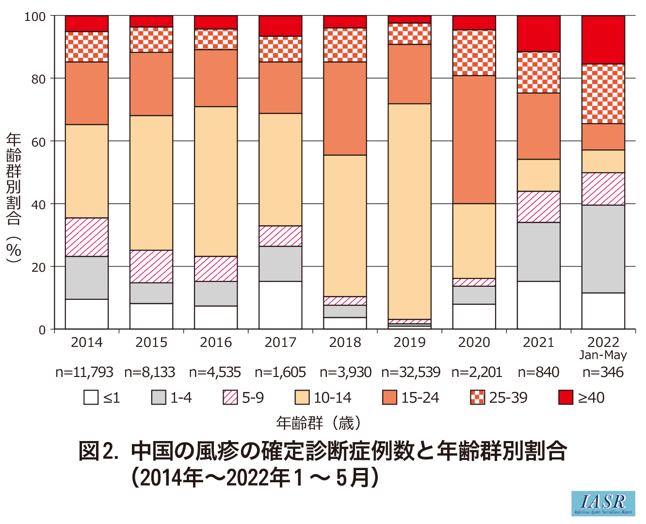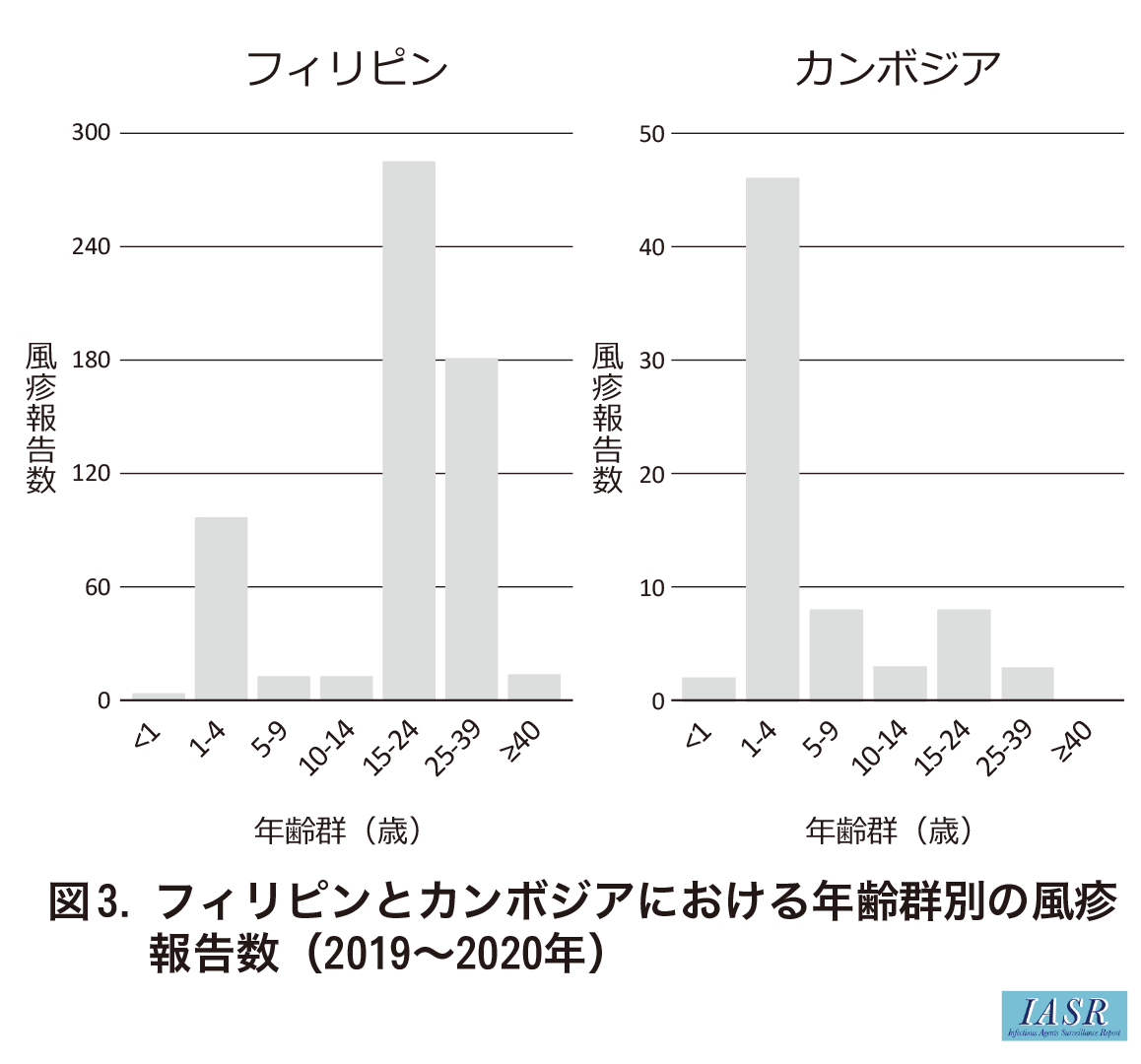 図2に示したように、中国では2018年以降(2019年は除く)、風疹症例の40%以上は15歳以上の青少年や成人から報告された。また、フィリピンでは、2019~2020年の大規模な風疹流行において、報告された600の風疹症例のうち77%が15~39歳の青少年や成人であった(図3)。