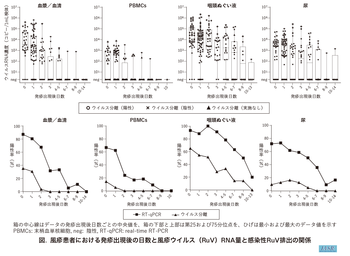 発疹出現後の日数とRuV-RNA量と感染性RuV排出との関係を図に示す。RuV-RNA量の全体での中央値は、血漿/血清で138〔四分位範囲(IQR):2-2、367〕コピー/mL、PBMCsで2(IQR:2-424)コピー/mL、咽頭ぬぐい液で6,126(IQR:407-34,473)コピー/mL、尿で323(IQR:2-3,609)コピー/mLであった。RuV-RNAと感染性RuVの排出は発疹出現後0~2日でピークに達し、時間経過とともに減少した。RuV-RNA量の発疹出現後日数ごとの中央値は、血漿/血清で3日目、PBMCsで2日目、咽頭ぬぐい液で10~13日目、尿で6~7日目に検出下限値以下になった。感染性RuVは、血漿/血清で2日目、PBMCsで1日目、咽頭ぬぐい液で8~9日目、尿で4~5日目まで分離が可能であった。RuV-RNA量が多いほど、また、発疹出現からの日数が短いほど感染性RuVが存在する可能性が高かった。