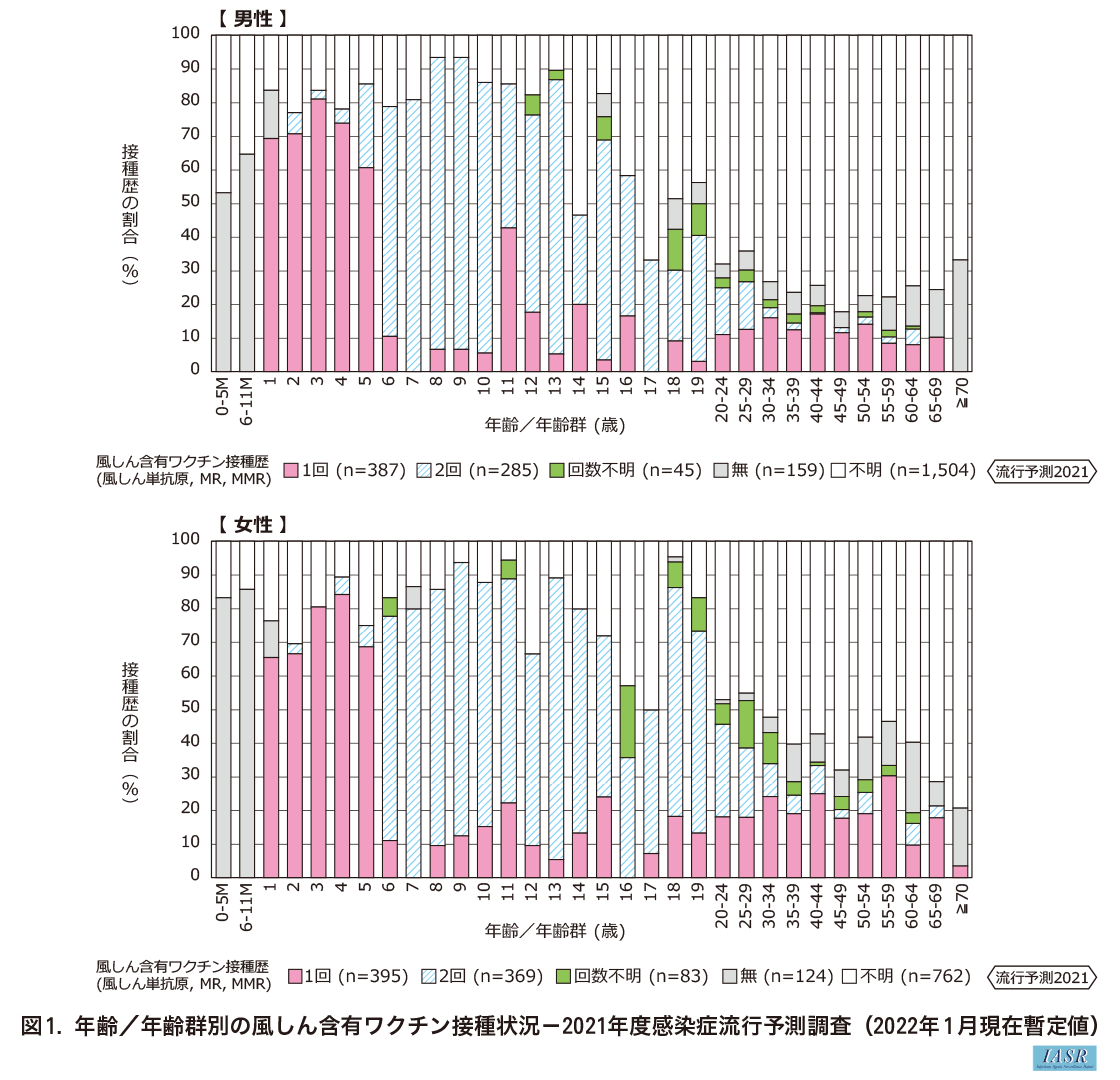 2021年度調査において、1回以上接種者(1回・2回・回数不明)の割合は、1歳の女性で65%、男性で69%、2歳では女性で70%、男性で77%であった。20歳以上群における接種割合は男性が19%(20-24:28%、25-29:30%、30-34:21%、35-39:17%、40-44:20%、45-49:13%、50-54:18%、55-59:12%、60-64:14%、65-69:10%、≧70:0%)、女性が36%(20-24:52%、25-29:53%、30-34:43%、35-39:29%、40-44:34%、45-49:24%、50-54:29%、55-59:33%、60-64:19%、65-69:21%、≧70:3%)であり、男性で低かった。風しん含有ワクチンの接種歴不明であった者の割合は、0~19歳で男性が7-67%、女性が5-50%、20歳以上群で男性が64-82%、女性が45-79%であり、20歳以上群では20歳未満群に比べ接種歴不明者が多い傾向にあった。第5期接種対象者を含む40~59歳の年齢群男性の接種割合は15%であった。本年度の調査では、男性11歳(接種歴不明1名、1回接種3名、2回接種3名)、男性17歳(接種歴不明4名、2回接種2名)のように、調査数がごく少数の年齢がいくつか認められている。調査数の少ない年齢では結果の解釈に注意が必要である。