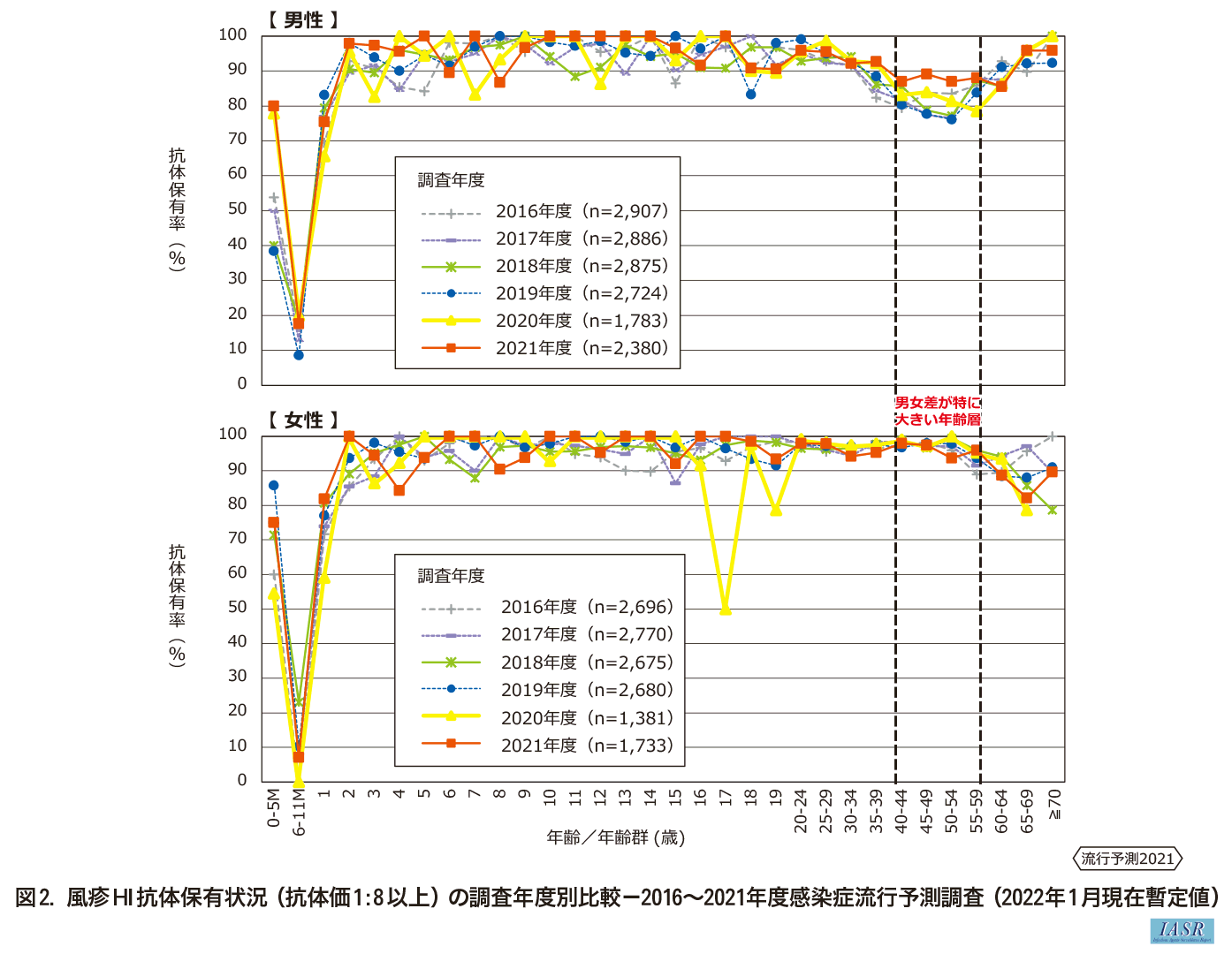 2021年度調査における抗体保有割合は、生後0~5か月で78%、生後6~11か月で13%、1歳で79%であった。2歳以降の年齢/年齢群では、おおむね90%以上であった。男女別に比較をすると、2歳~50代の女性では、ほぼすべての年齢群で90%以上(84-100%)であったのに対し、男性では40代前半~60代前半の年齢群で90%を下回り、女性に比べ低かった。