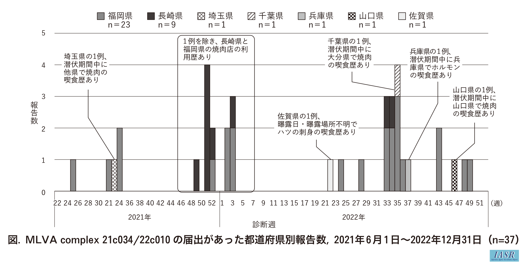 症例は、福岡県が23例、長崎県が9例の順に多く、埼玉県・千葉県・兵庫県・山口県・佐賀県から各1例で広域の自治体から報告された(図)。