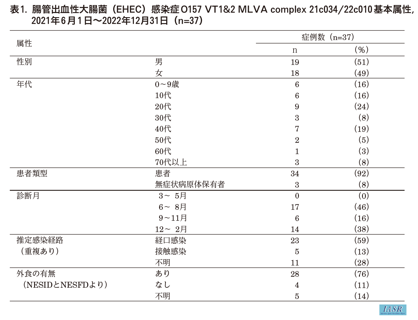 症例37例は、男性が51%で性差はなく、年齢中央値が27歳で範囲が1-78歳と幅広い年齢層であった。発症患者が92%と多かったが、HUS等の重症例はなかった。診断月は、6~8月が46%で、12月~翌年2月が38%の順に多かった。推定感染経路は、経口感染59%、接触感染13%、不明28%であった。経口感染についてNESFDデータを含めると、潜伏期間(2-10日)に28例(76%)の外食歴があった(表1)。