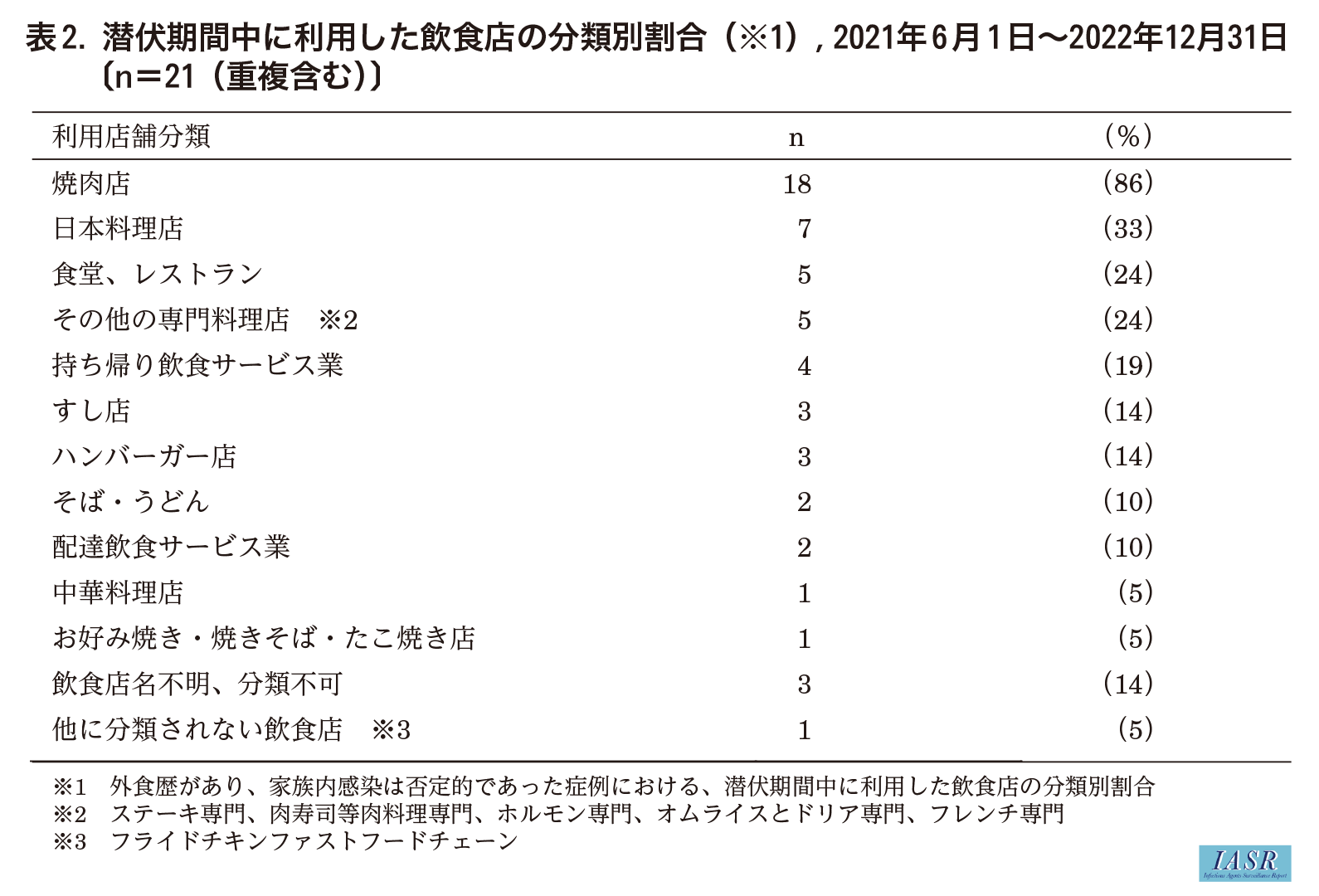 外食歴のあった28例中家族内感染を否定できない7例を除いた21例について、潜伏期間に利用した飲食店を分類した結果、焼肉店が86%(18/21例)で最も多かった(表2)。焼肉店の所在地は、福岡県が56%(10/18例)、長崎県が28%(5/18例)、大分県・山口県・他県が各1例で、個別の感染事例として扱われていた。