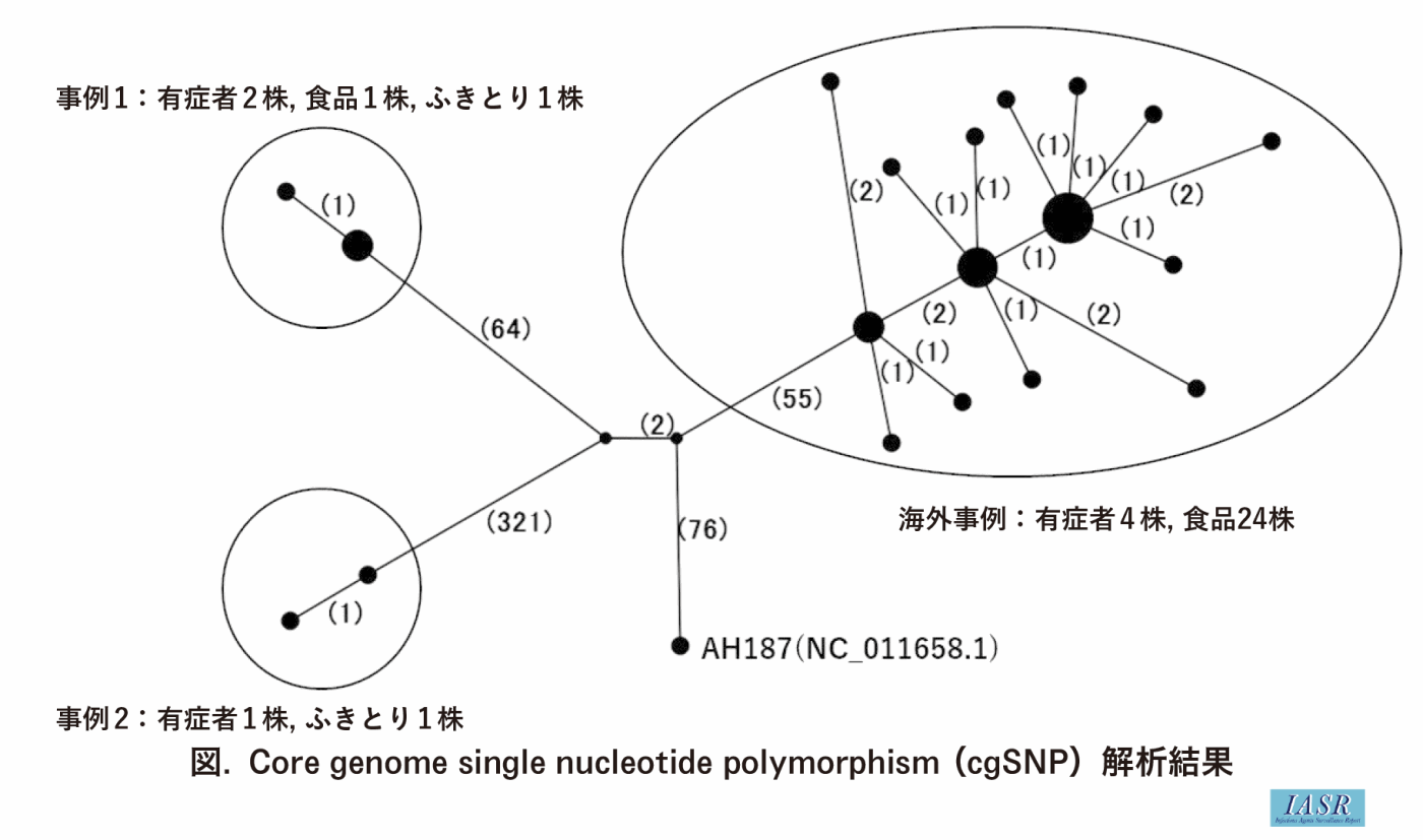 疫学調査および微生物検出状況だけでは原因施設の特定が困難であった事例においても、分離菌株間のcgSNP解析が判断に有用な事例を経験した。今後もゲノム配列データを取得し、事例対応に利用していく。