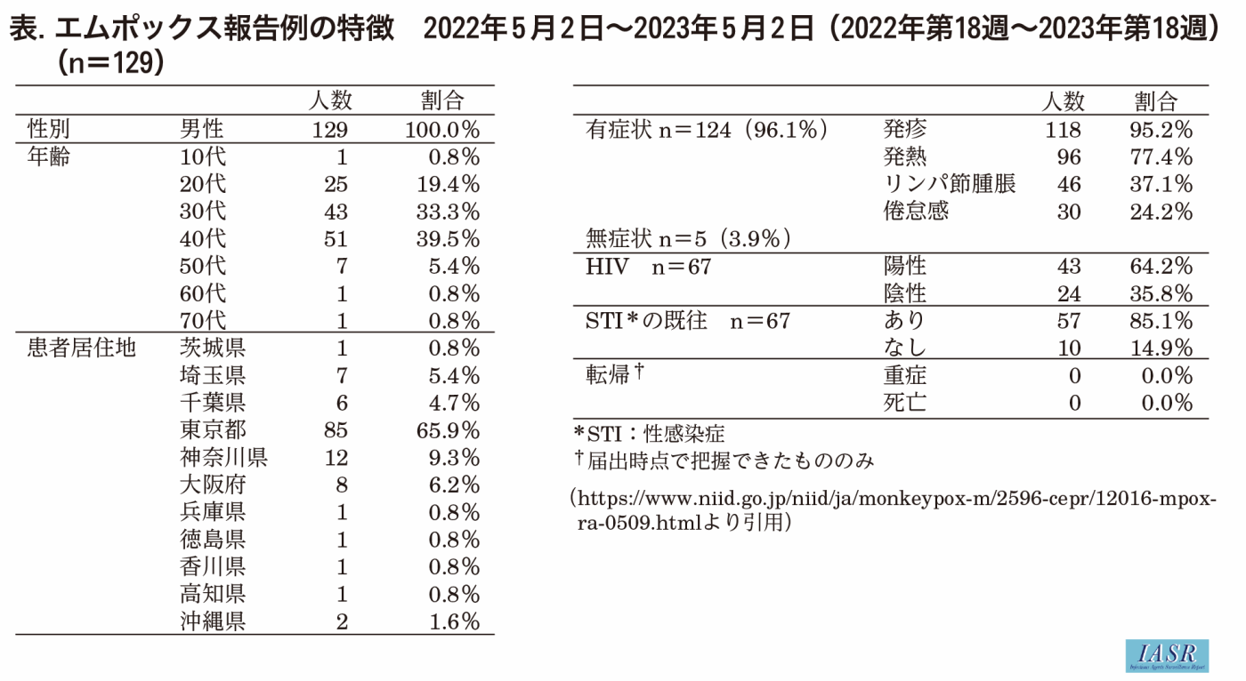 2022年5月~2023年5月2日時点までに129例が報告されている(表)。性別はすべて男性で、30代と40代が73%(94/129)を占めている。報告された症状のなかでは、発疹95%(118/124)、発熱77%(96/124)、リンパ節腫脹37%(46/124)の順に多かった。HIVの罹患状況が把握できた67例のうち、43例(64%)がHIV陽性者であった。現時点では重症例、死亡例の報告はない。居住地については、2023年2月中旬(第7週)までは関東圏のみの報告であったが、その後関西圏をはじめ東海、四国、沖縄県で報告されており、全国的な広がりを認めている。