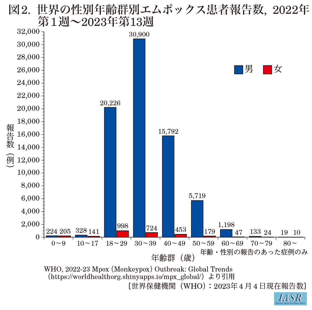2022年5月以降、欧米を中心に、常在地域への渡航歴のないエムポックス症例が相次いで報告された(図1)。ヒトからヒトへの伝播が確認され、前例のない流行となり、2023年5月11日時点で111カ国87,377例が確認されている。この流行で報告されている症例の多くは男性であり、men who have sex with men(MSM)が多く含まれていた。病変の部位などから、性的接触にともなう伝播が中心となっている可能性が指摘されている。なお、少数ではあるが、MSM以外の男性、小児、女性の感染例の報告もある(図2)。2022年7月23日、世界保健機関(WHO)事務局長は、「国際的に懸念される公衆衛生上の緊急事態(Public Health Emergency of International Concern:PHEIC)」に該当することを宣言した。