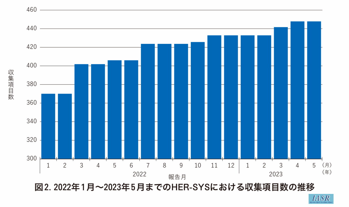 COVID-19サーベイランスの基幹データであるHER-SYSにおける届出件数とダウンロードしたデータ量を報告年月別にプロットしたところ、2020年12月には50万件を超え、データ量も1GBとなった。発生届の日次集計の運用が開始された2022年9月26日までに2,195万件、データ量も42.5GBとなった(図1)。またはオミクロン期の2022年1月~2023年5月までのHER-SYSデータとして収集された項目数を時系列に整理したところ、78項目増えていた(図2)。既存のデータを整理する項目などが含まれており、すべてが新規に追加されたものではないことに注意が必要であるが、パンデミックの拡大とともにデータ量およびデータ項目も大きく増加していることが分かる。