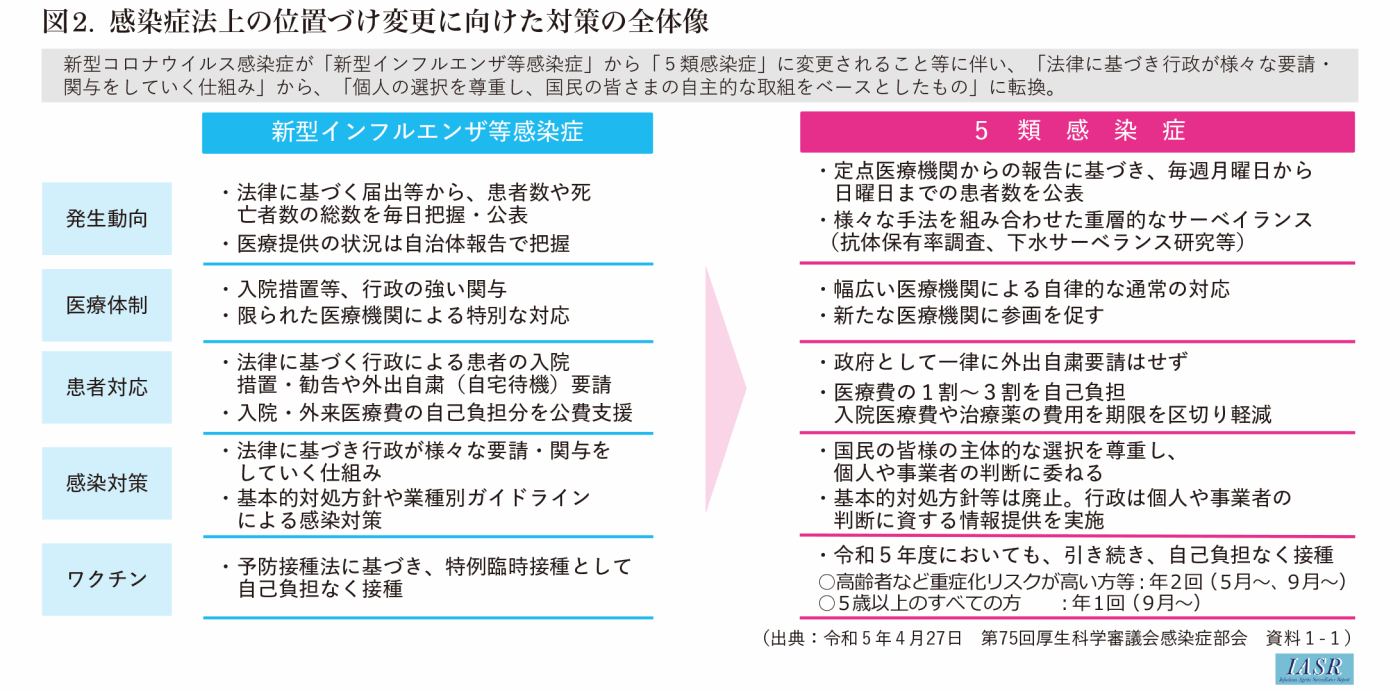 国内における発生動向は、厚生労働省のオープンデータによると、2020年1月16日~2023年5月7日(2023年5月9日現在)に報告された検査陽性者(陽性者)数は33,803,572人、死亡者数は74,694人であった(図1)。2022年9月26日より感染症法に基づく医師の届出の対象を限定した運用が全国でなされてきたが(IASR 43:271-272, 2022)、2023年5月8日からは感染症法上での取り扱いが「新型インフルエンザ等感染症」から定点報告対象の「5類感染症」に変更されたことを受けて対策も変更され(図2)、全国約5,000カ所のインフルエンザ/COVID-19指定医療機関からの報告となった。これを受けて新型コロナウイルス感染者等情報把握・管理支援システム(HER-SYS)の運用が停止され、2023年第19週から感染症サーベイランスシステムに移行して、他の定点把握対象の5類感染症と同様に、集計・還元が行われている(感染症発生動向調査週報ダウンロード2023年)。