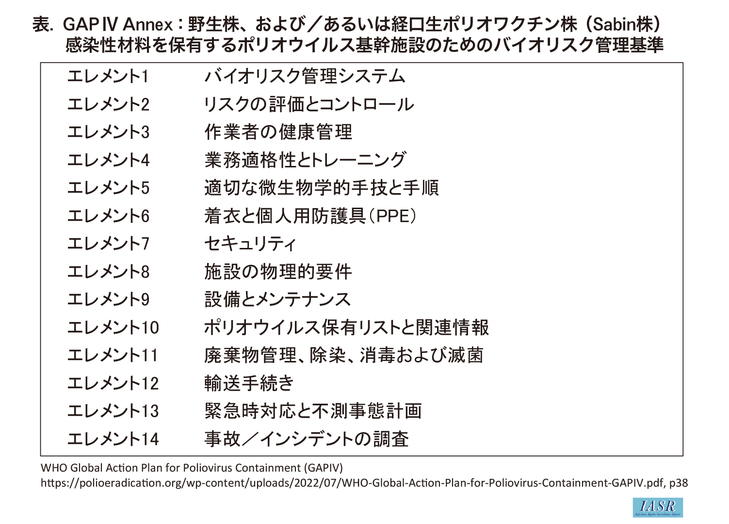 WHOは、2022年7月にポリオウイルス・バイオリスク管理に関する世界的行動計画改訂第四版(WHO Global Action Plan for Poliovirus Containment: GAP4)を公開した4)。GAP4では、施設、場所、および実施される作業を考慮したリスクベースのアプローチの活用を強調しており、リスク評価に基づいて適切なリスク管理策を策定・実施する必要がある。GAP4 Annex「野生株およびSabin/OPVポリオウイルス材料を保有するポリオウイルス基幹施設のためのバイオリスク管理基準」(表)では、施設における安全対策要件を示しており、NACによるPEF認証の基準となる。施設におけるバイオリスク管理基準は、施設に関連したポリオウイルス漏出のリスクを最小化するためのものであり、バイオリスク管理体制の整備、リスク評価、封じ込め施設の設計と運営、ワクチン接種、ならびにウイルス漏出または曝露が生じた場合の緊急時対応計画などからなる。