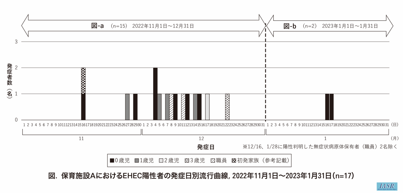 陽性者と施設関係者の最終接触日(2022年12月20日)から4週間、新規陽性者を認めていなかったが、2023年1月24日、0歳児クラス園児(D)が新たにEHEC感染症で届け出られた(図-b)。園児(D)は、1カ月前には検査陰性であったが、1月17日から発熱・下痢・血便を呈していたことが判明した。それを受け0歳児クラス園児および担任職員へ検便を実施した結果、園児(E)1名と陽性園児のパンツを処理した職員1名が陽性となった。3名いずれの陽性者も、喫食歴調査からは感染源を疑わせるような背景は確認されなかった。園児(E)は、1カ月前に陽性となり、2回陰性確認後登園を開始していたが、1月16日から軟便を認めていた。0歳児クラスでは感染伝播が懸念されたが、施設では引き続き感染対策が強化されており、拡がりは限定的であった。その後、再度の0歳児クラス園児・職員一斉検便の実施、全員陰性の確認を経て、最終接触から4週間後の2月24日に終息した。また、本事例において重症例は認めなかった。