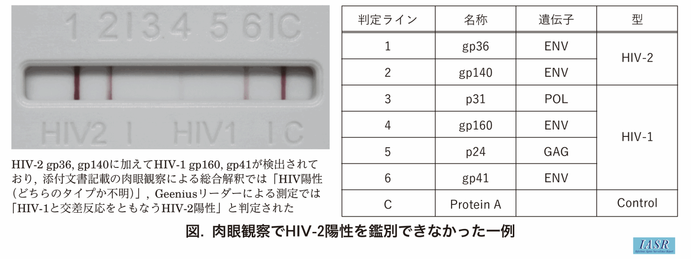 Geenius HIV-1/2キットは肉眼観察と専用の読み取り装置「Geeniusリーダー(バイオ・ラッド ラボラトリーズ)」の両方で使用可能である。感染研における経験で、HIV-1鑑別診断には大きな支障がない一方、HIV-2確認検査用診断薬「ラブ ブロット2」で見られたのと同様に、HIV-2感染者血漿とHIV-1判定ラインとの交差反応が起こりやすく、肉眼観察に基づく解釈では、その40%程度がHIV-2陽性を鑑別できないことが分かっている(図)5)。鑑別可能な例でも、多くはHIV-1判定ラインとの交差反応があり、解釈には注意を要する。これらの大半は「Geeniusリーダー」を用いることにより「HIV-1と交差反応をともなうHIV-2陽性」と判定される5)。HIV-2感染例の感染診断対応に加え、人為的なミスによる誤判定を避けるためにも「Geeniusリーダー」の使用が推奨される。診療におけるHIV-1/2感染症の診断ガイドライン6)にしたがって感染診断を行い、HIV-2核酸増幅検査が必要な場合には、感染研または地方衛生研究所等に相談する。