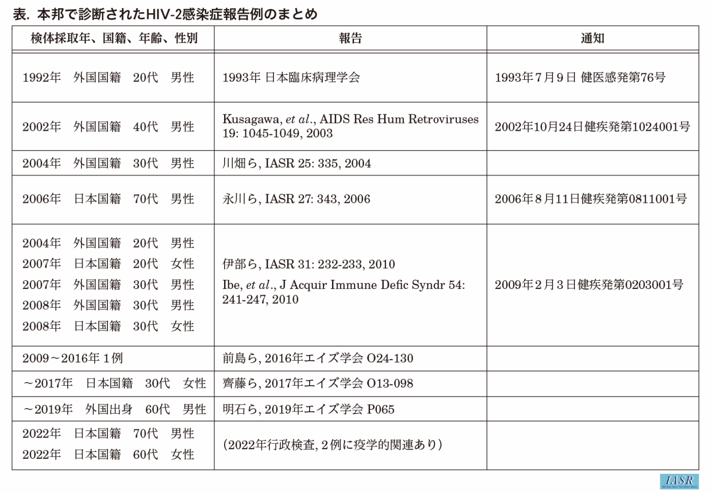 日本の感染症発生動向調査では「後天性免疫不全症候群発生届(HIV感染症を含む)」において、HIV-1とHIV-2を区別して報告する仕組みはなく、HIV-2感染症の報告数を区別して把握することはできない。そのため、把握可能な過去に学会・論文発表された12例と、2022年に行政検査で陽性と判明した2例を合わせた14例を表に示した。検体採取年、国籍、年齢、性別などは様々であり、1970年代に西アフリカで感染したと推定される症例も含まれている。ただし、学会や論文などで報告されていない症例で、国立感染症研究所(感染研)や国立病院機構名古屋医療センターで検査されなかった症例はこの表に含まれない。