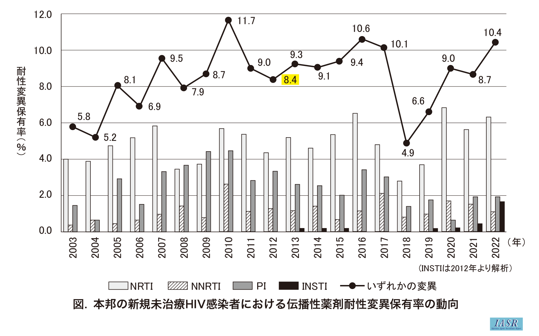 本邦での新規未治療HIV感染者の伝播性薬剤耐性変異の動向を図(図、黄色マーカー部分を5.8→8.4へ修正)に示す。サーベイランスのための伝播性薬剤耐性変異のリストは、プロテアーゼ阻害薬(PI)、核酸系逆転写酵素阻害薬(NRTI)、非核酸系逆転写酵素阻害薬(NNRTI)については2009年2)に、インテグラーゼ阻害薬(INSTI)については2019年3)に世界保健機関(WHO)のワーキンググループにより作成されたリストに従った。