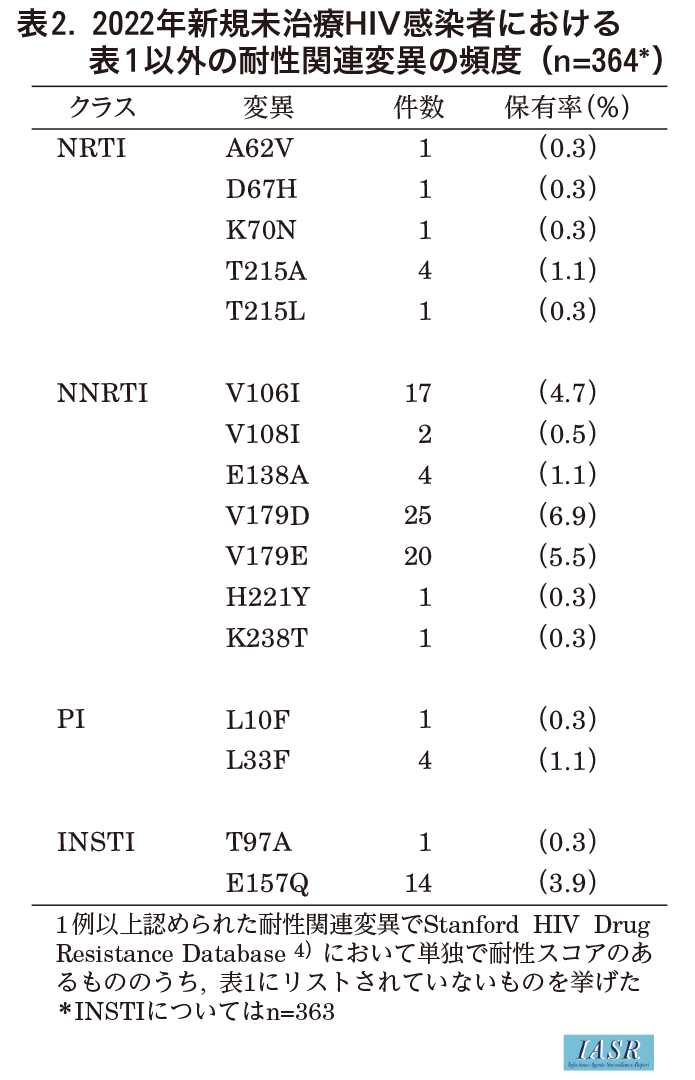 2022年の薬剤クラス別内訳では、NRTI 6.3%(23/364)、NNRTI 1.1%(4/364)、PI 1.9%(7/364)、INSTI 1.7%(6/363)であり、INSTIに対する伝播性薬剤耐性変異保有率は過去最大となった。2022年新規未治療HIV感染者に検出された伝播性薬剤耐性変異の内訳を表1に示す。インテグラーゼ E138Kは6件に検出され、過去最多であった。インテグラーゼ E138Kは本邦で伝播クラスタを形成している。NRTIのラミブジン(3TC)やエムトリシタビン(FTC)に対する耐性変異であるM184Vは2020年以降毎年3件以上検出され、2022年も3件検出されており、注意が必要である。比較的古い世代のPIに対する耐性変異のM46I/L、NRTIのジドブジン(AZT)等に対する耐性変異の復帰変異であるT215C/D/E/S/I/V(T215X)などは本邦で複数の伝播クラスタを形成して定着している。その他、表1にリストされていないpolymorphic mutationも含めたminor mutationを表2に示す。